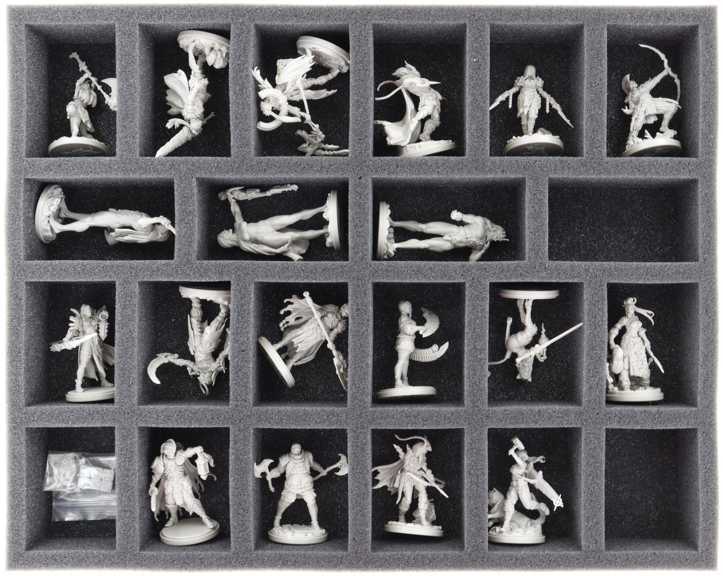 - 1 Full-Size foam tray with 25 compartments for standard miniatures like Mad & Mighty Striker, Cursed Spear, Father & Son, Dead Survivor, and models with similar dimensions (FSLQ040BO)
