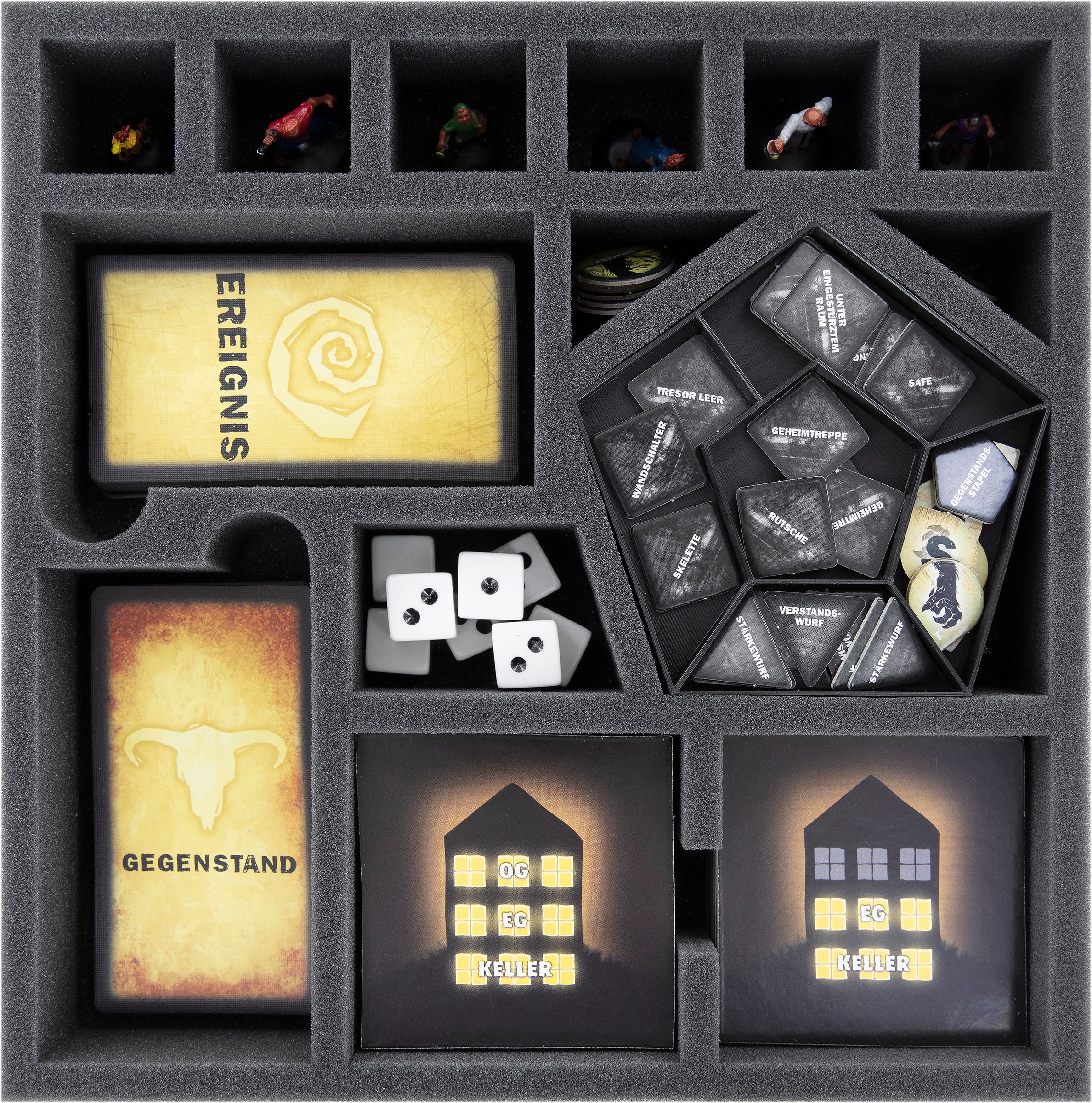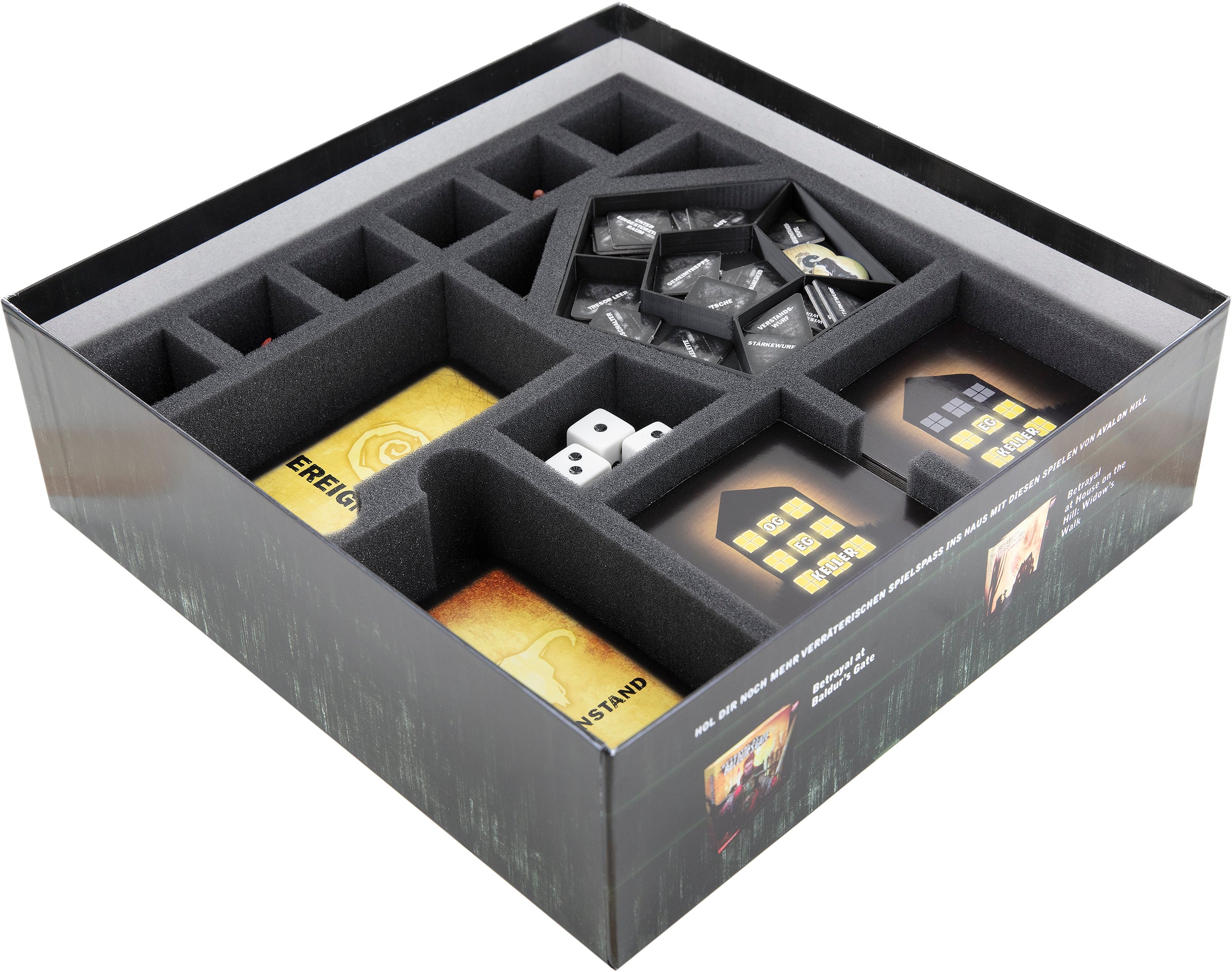 • 1 foam tray with 14 compartments for miniatures + game cards like event cards, item cards, omen cards, player overview cards, traitor and monster overview cards + small-sized game components like room tiles, token, dice, hexagonal character cards