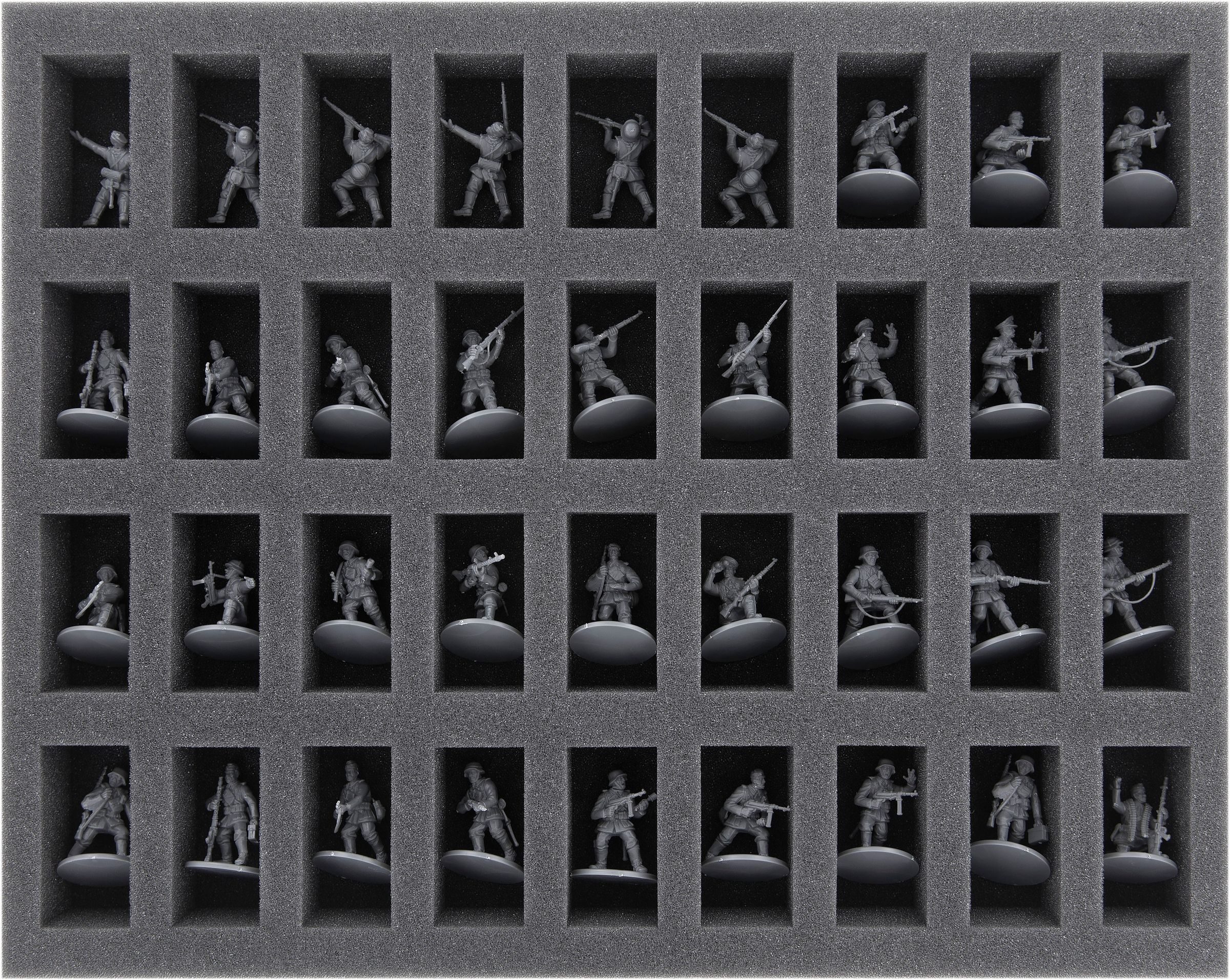 This Feldherr foam tray has 36 same-sized compartments for the clear and safe storage of wargaming miniatures in scale 1:72 (20 mm). The tray is thus ideally suited for miniatures of e. g. the games "Behind Omaha", "Rapid Fire" oder "Point Blank Game".