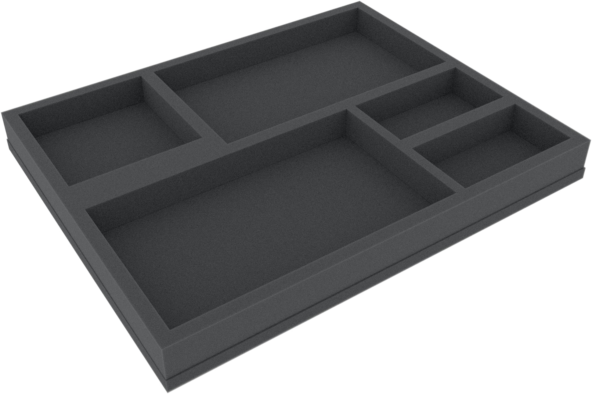 Questo vassoio in schiuma ha 5 scomparti per lo stoccaggio sicuro del materiale da gioco da tavolo. Due grandi scomparti sono ideali per le piastrelle, tre scomparti più piccoli sono adatti per piccoli accessori come ad esempio i gettoni. La schiuma a pori fini offre la massima protezione contro la rottura di parti e graffi.