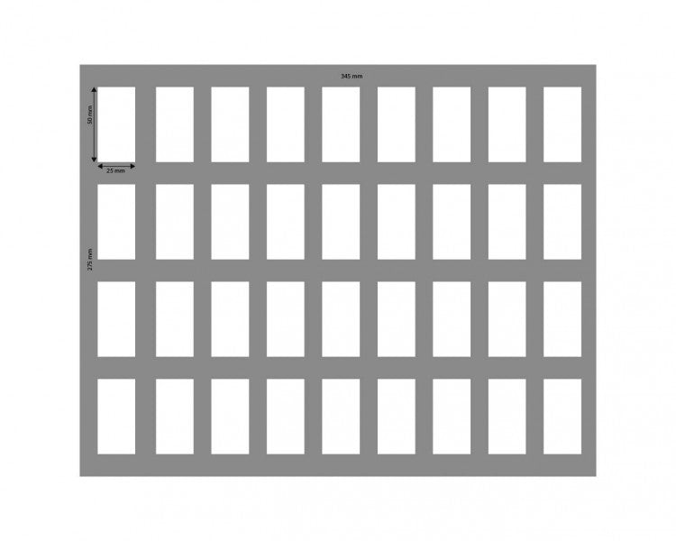 - Ciascuno dei 36 scomparti è lungo 50 mm x 25 mm di larghezza x 30 mm di profondità.