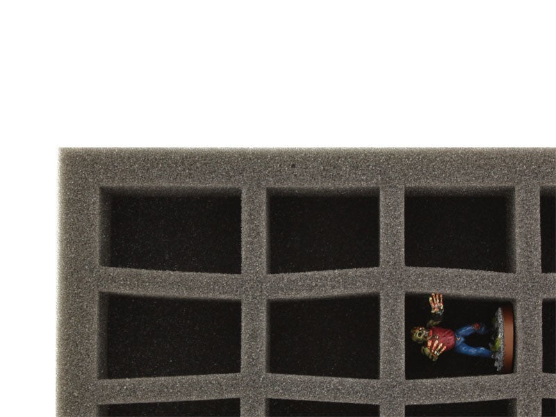 Vassoio in schiuma con design a c-slot. Le fessure hanno un'impronta conica. Le dimensioni del tappetino in schiuma con 45 fessure sono le stesse del tappetino in schiuma con 36 fessure (345 mm x 275 mm). Abbiamo gli slot disposti in modo da risparmiare spazio e ottimizzare le distanze tra gli slot. Sul tappetino cinque file sono preforate con nove slot. La lunghezza del lato più lungo della fessura varia in tre fasi: 37, 39 e 49 mm. In questo modo si hanno a disposizione le seguenti fessure 18x fessure: 49 mm x 25/30 x 30 mm (L x B x P) 18x fessure 39 mm x 25/30 x 30 mm (L x B x P) 9x fessure 37 mm x 25/30 x 30 mm (L x B x P) La forma conica di taglio offre spazio extra per le vostre miniature. A differenza dell'inserto standard (FS035C5B) con altezza nominale di 25 mm, qui sono disponibili altri 5 mm di altezza in più.