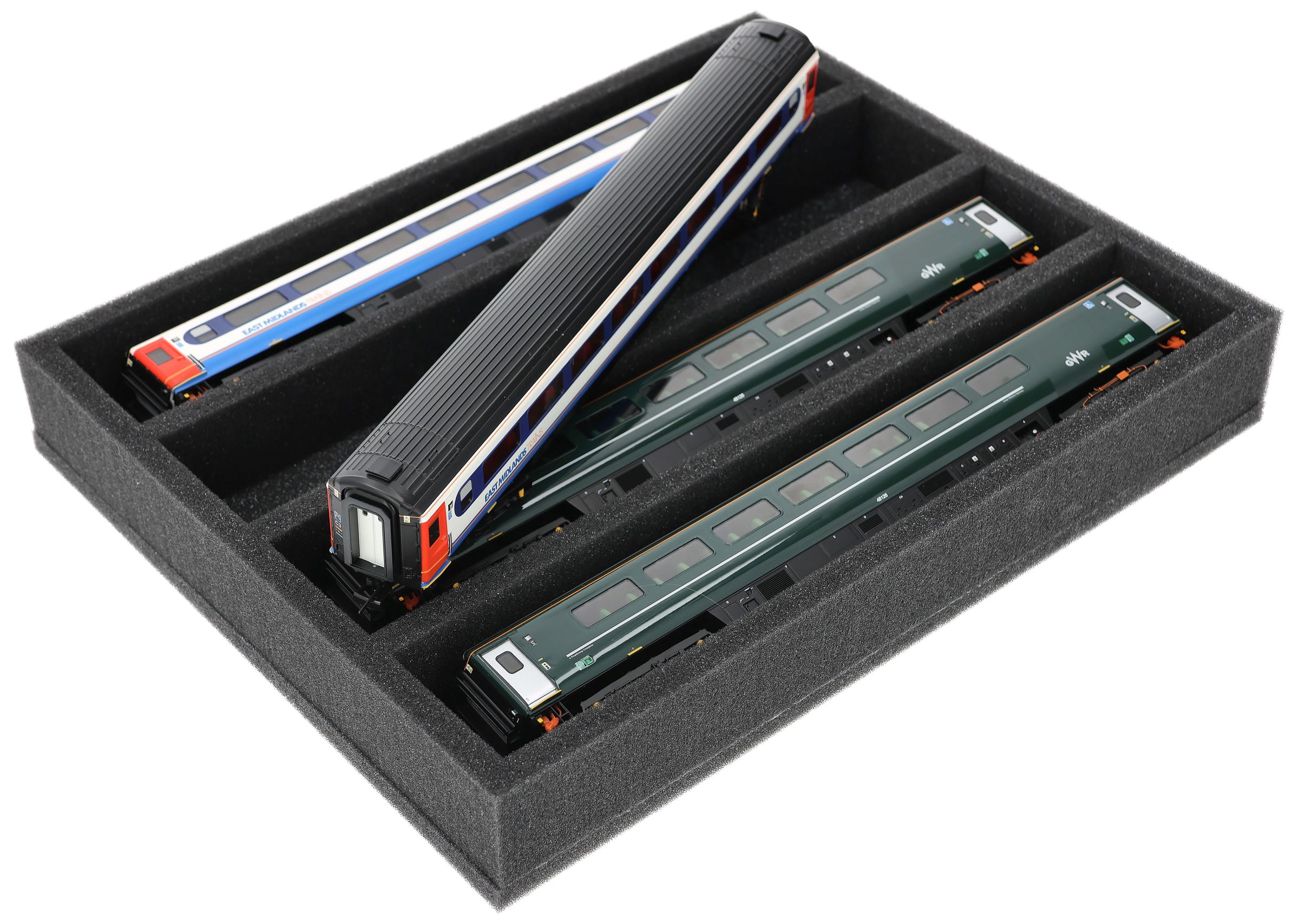 Several trains and carriages can be stored next to each other in one compartment. In order to prevent collision or unintentional coupling, we offer suitable foam spacers (HS040A002) to separate your vehicles.