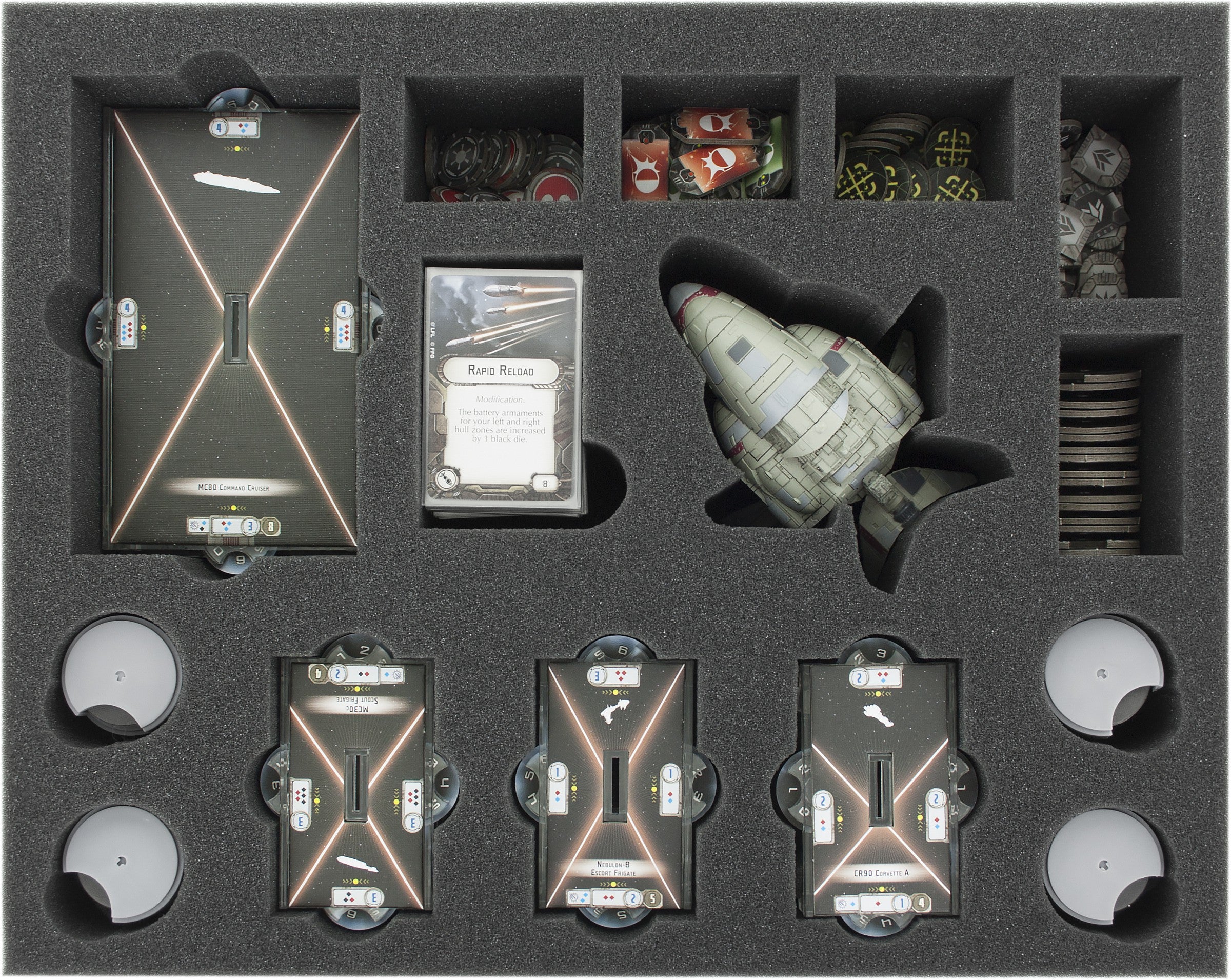 With these foam tray your Rebel units are save. The mat fits exactly for the following miniatures and equipment: Assault Frigate Mark II, bases, cards in sleeves, token, Commando and Speed Dials as well as individually usable compartments. So you keep your Rebel fleet safely together.