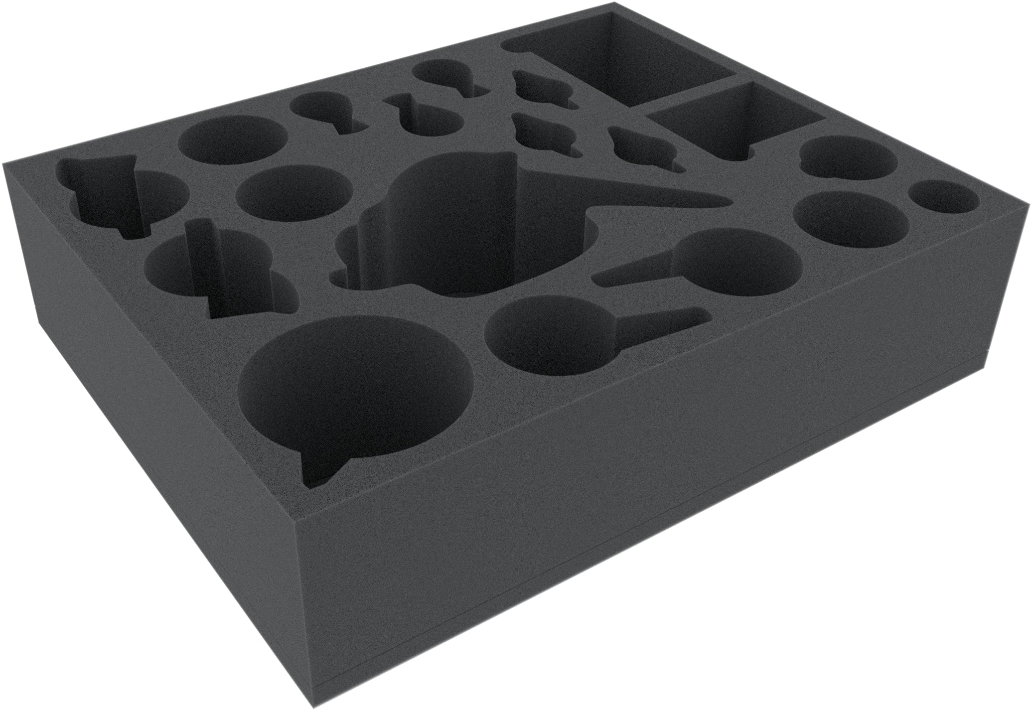 - The foam tray has the dimensions: 345 mm x 275 mm x 85 mm total height (75 mm usable height + 10 mm foam base).