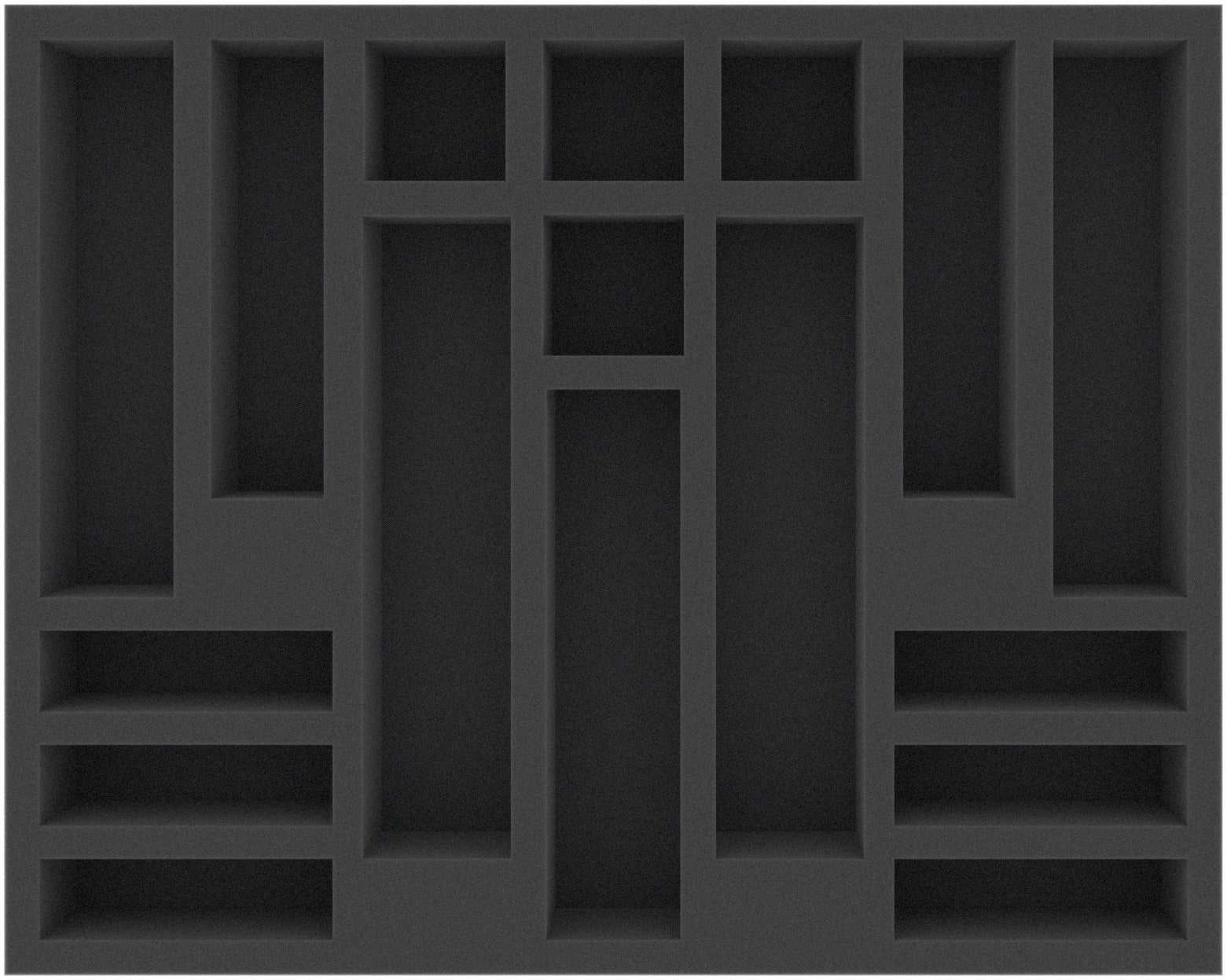 This 45 mm high foam tray is divided into 17 compartments. It is particularly suitable for the safe storage of tabletop and board game miniatures, as well as other fragile models and small parts.