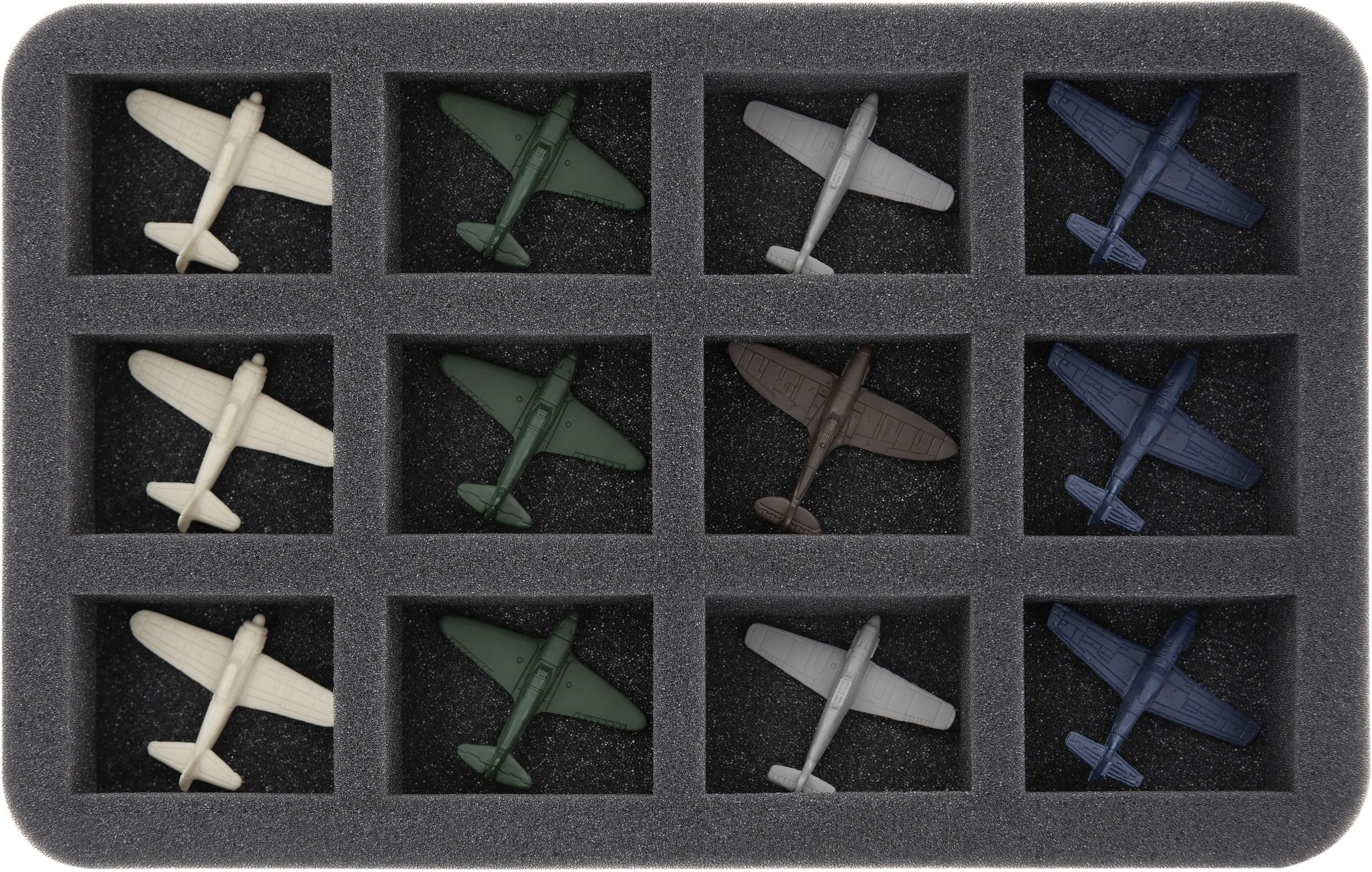 This Half-Size foam tray is divided into 12 compartments of the same size. These can hold up to 12 aircrafts without flying base.