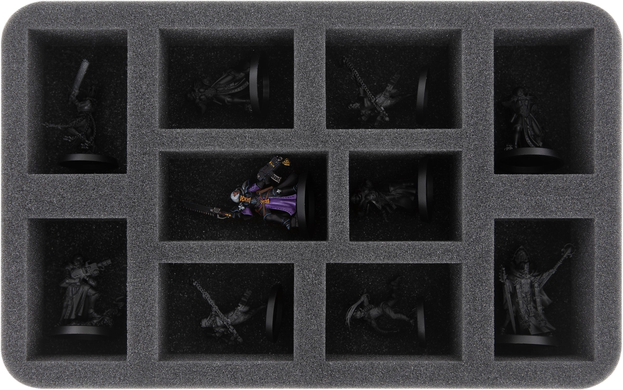 On this Half-Size foam tray 10 compartments offer your models a safe shelter. The compartments of different sizes are ideal for standard units of the Adepta Sororitas with slightly protruding details.