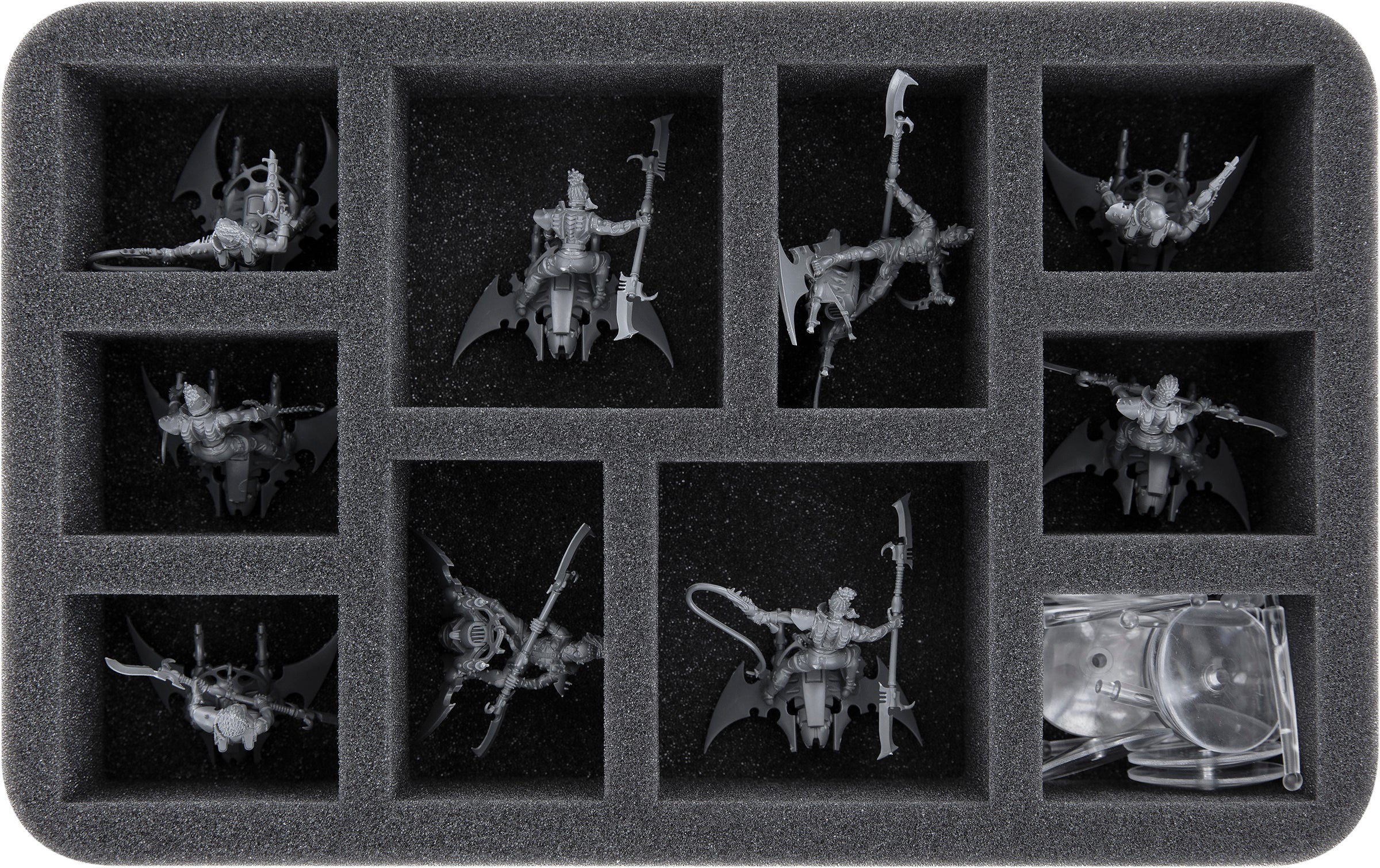 On this Feldherr foam tray you have space for up to 10 miniatures of your army. The insert is particularly suitable for storing the Hellions, for example. The flying bases are stored separately.