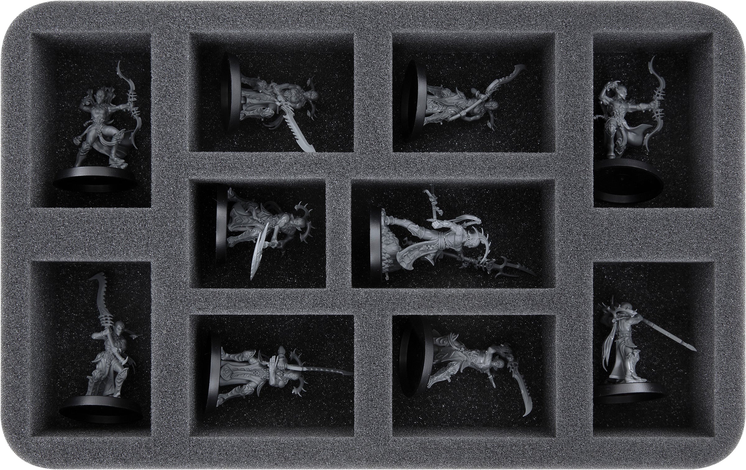 This Feldherr foam tray with ten compartments gives larger miniatures on bases up to 40 mm sufficient space. In addition to standard infantry (e.g. Namarti Thralls / Reavers) you can also give larger or wider figures such as the Tidecaster a safe place to store.