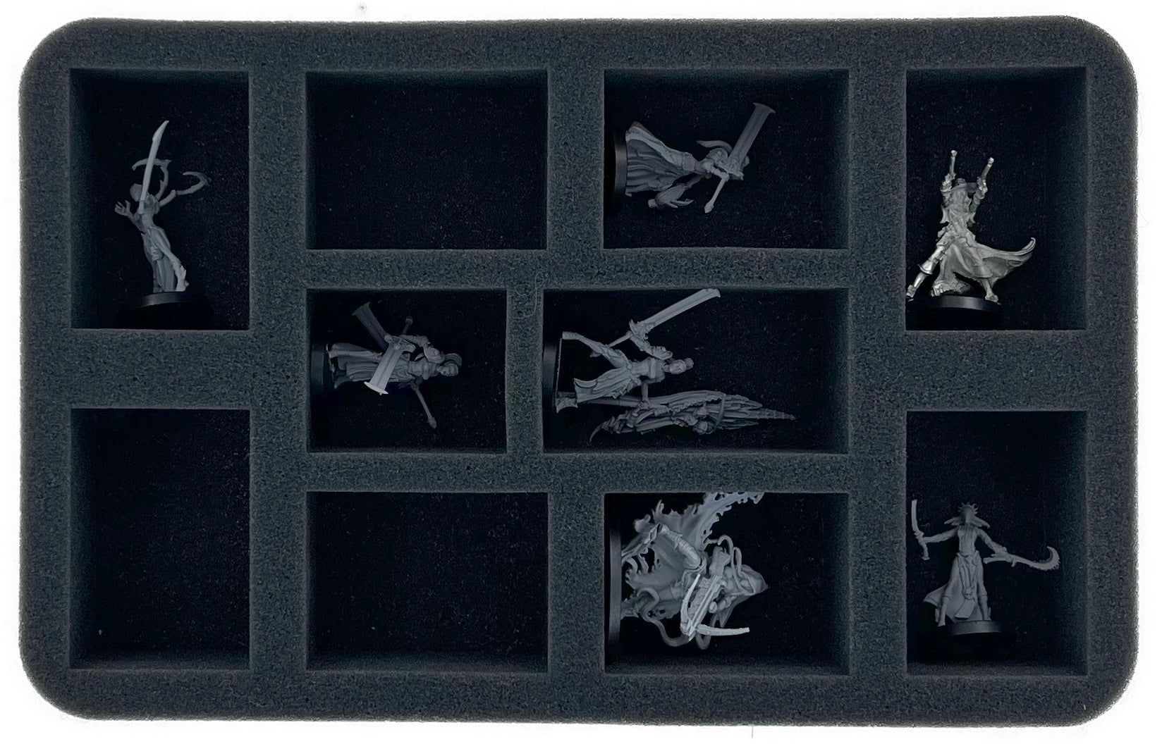 On this Half-Size foam tray you have space for up to 10 miniatures of your Raging Heroes. The insert is ideal for storing models on up to 40 mm bases