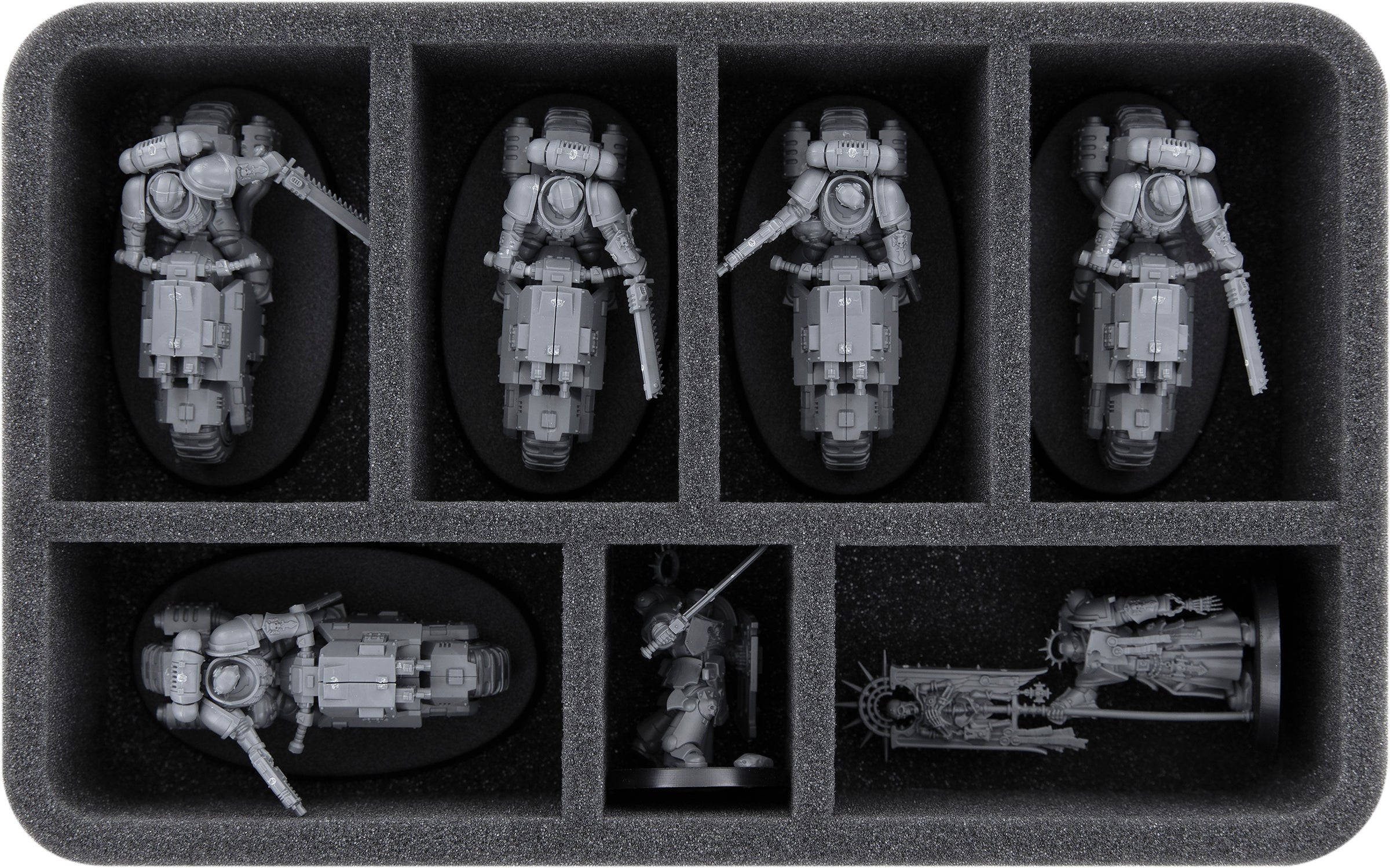 On this Feldherr foam tray you have space for up to 7 miniatures of your army. The insert is especially suitable for storing the Space Marines and similar sized models. The different sized compartments are ideal for keeping larger or bulkier models of your army clearly arranged and well protected.