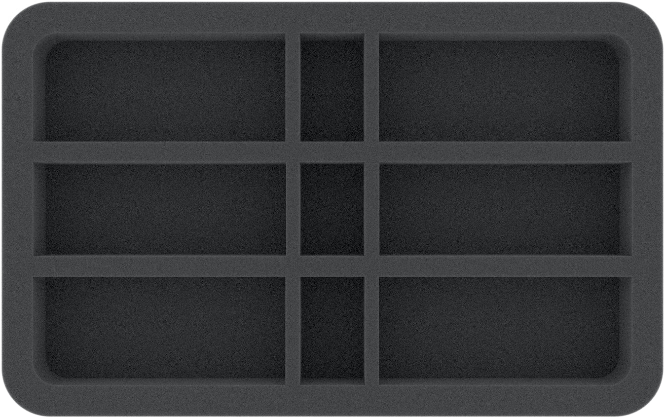 On this Feldherr foam tray you have space for up to 9 miniatures of your army. 6 compartments are particularly suitable, for example, for storing the Vanari Auralan Wardens and models with similar dimensions. The 3 small compartments can be filled with miniatures on bases up to 25 mm or accessories.