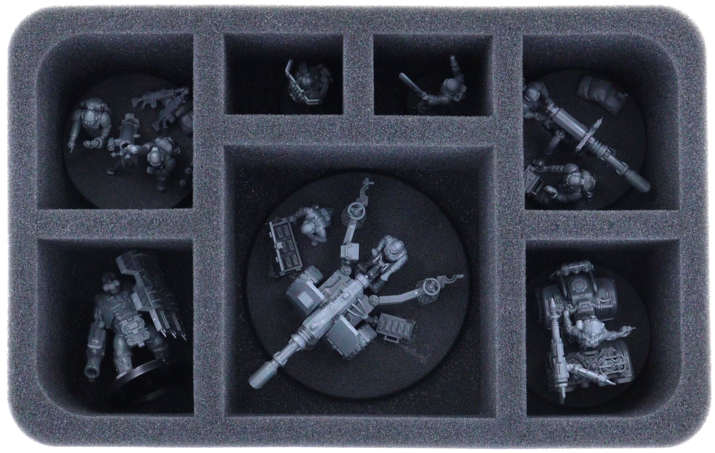 On this Feldherr foam tray you have space for up to 7 miniatures of your army. Ideal for storing Field Ordnance Battery in the largest compartment and Heavy Weapons Squad in the 4 next largest compartments.