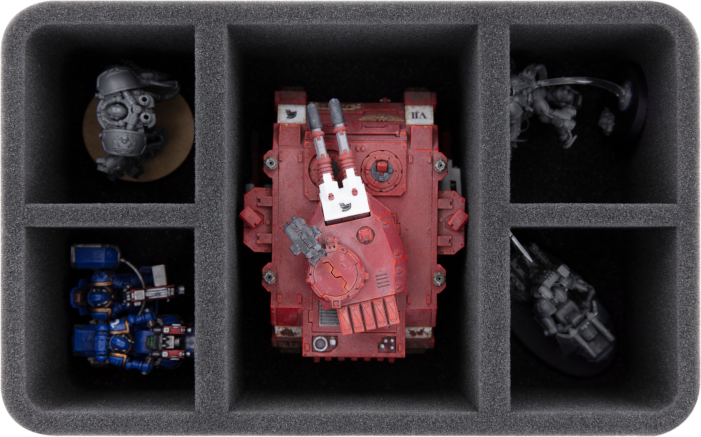 With this Feldherr Half-Size foam tray for the Space Marines Predator in all build variants, you have a total of 5 compartments available. Park your Predator in the large compartment in the middle.