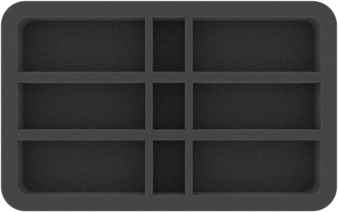 This Half-Size foam tray is divided into 9 compartments with 3 different sizes. It is particularly suitable for elongated tabletop and board game miniatures with bases up to 40 mm like Guards of the Galadhrim™ Court, Uruk-hai™ Warriors and miniatures of similar size.