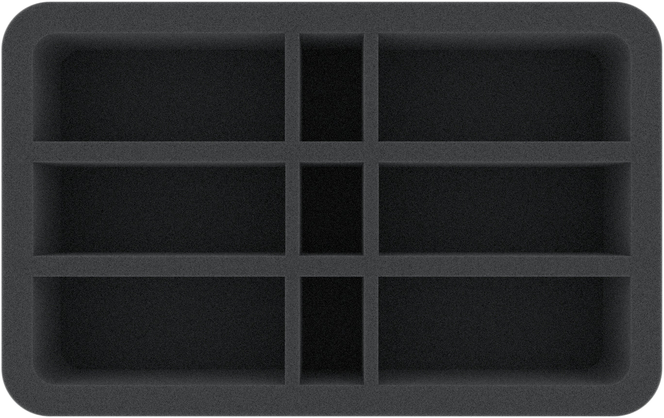 This Half-Size foam tray is divided into 9 compartments with 3 different sizes. It is particularly suitable for elongated tabletop and board game miniatures with bases up to 40 mm.