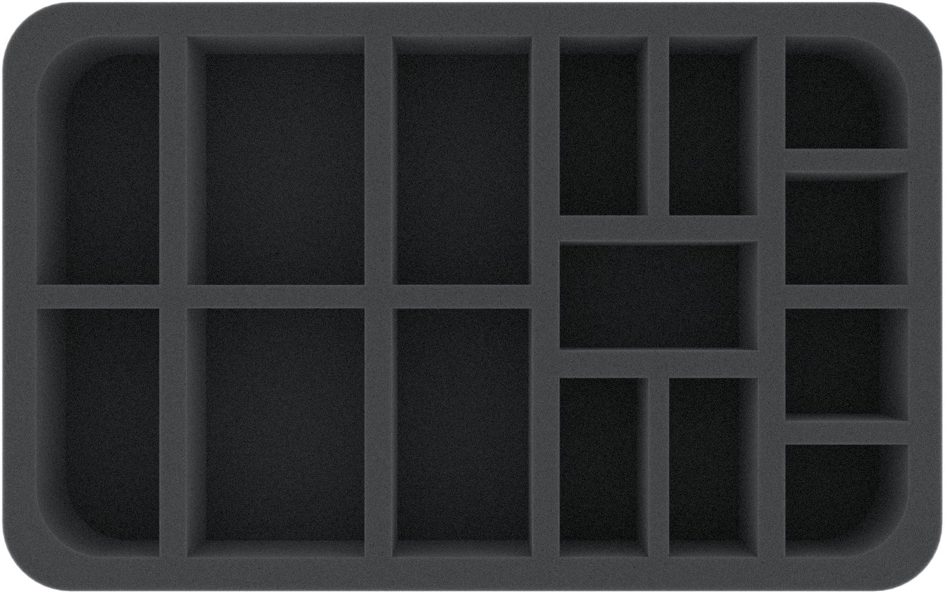 Questo vassoio in schiuma ha 15 scomparti di diverse dimensioni per riporre in modo sicuro e ordinato le miniature e gli accessori per il gioco da tavolo e per il wargame da tavolo. La schiuma a pori fini protegge in modo affidabile i vostri modelli dai danni.
