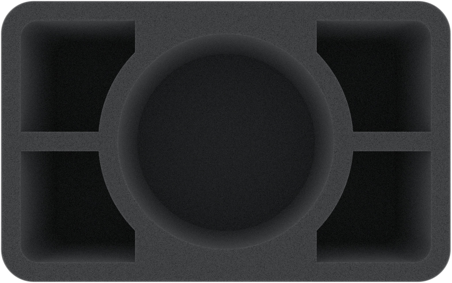 This Half-Size foam tray has 5 compartments of different sizes, one large round compartment and four smaller compartments. It is particularly suitable to safely store larger miniatures for various board games and tabletop systems. Game material or other small parts can also be neatly stowed here.