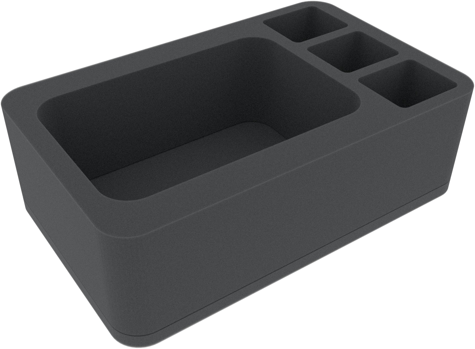 This Half-Size foam tray has 4 compartments of different sizes, one large rectangular compartment and three smaller ones. It is particularly suitable for safely storing a large miniature together with three smaller ones from different board games and tabletop systems. Game material, such as tokens and dice, as well as other small items can also be neatly stowed here.