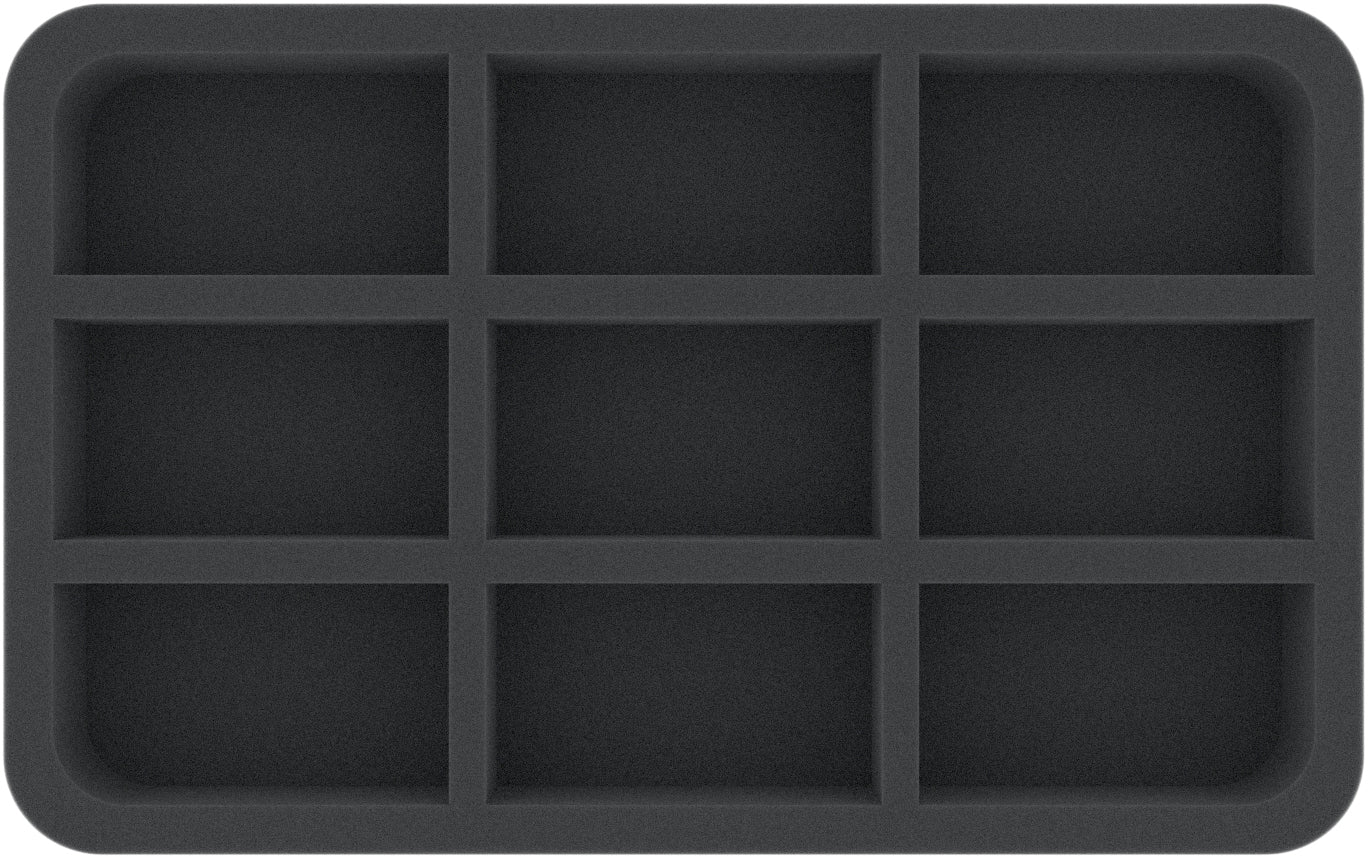 This Half-Size foam tray is divided into 9 compartments of the same size. It is particularly suitable for the safe storage of small to medium-sized figures for various board games and tabletop systems. Game material or other small parts can also be neatly stowed here.
