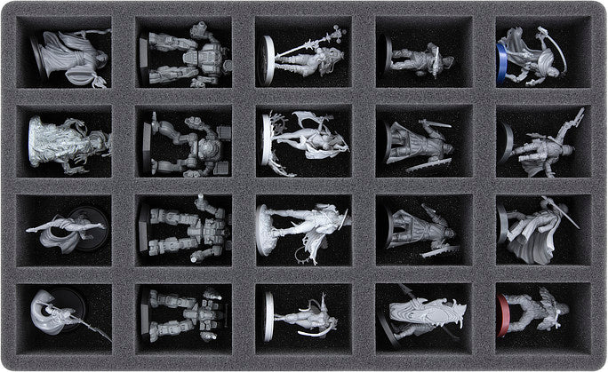This 45 mm tall foam tray is divided into 20 compartments. It is particularly suitable for the safe storage of tabletop and board game miniatures, as well as other fragile models and small parts.