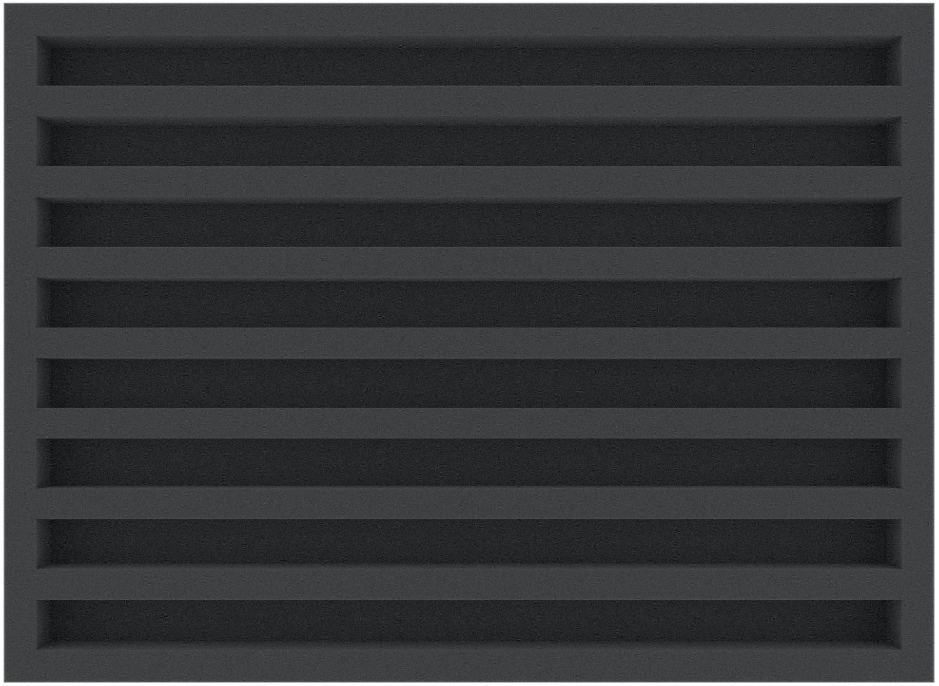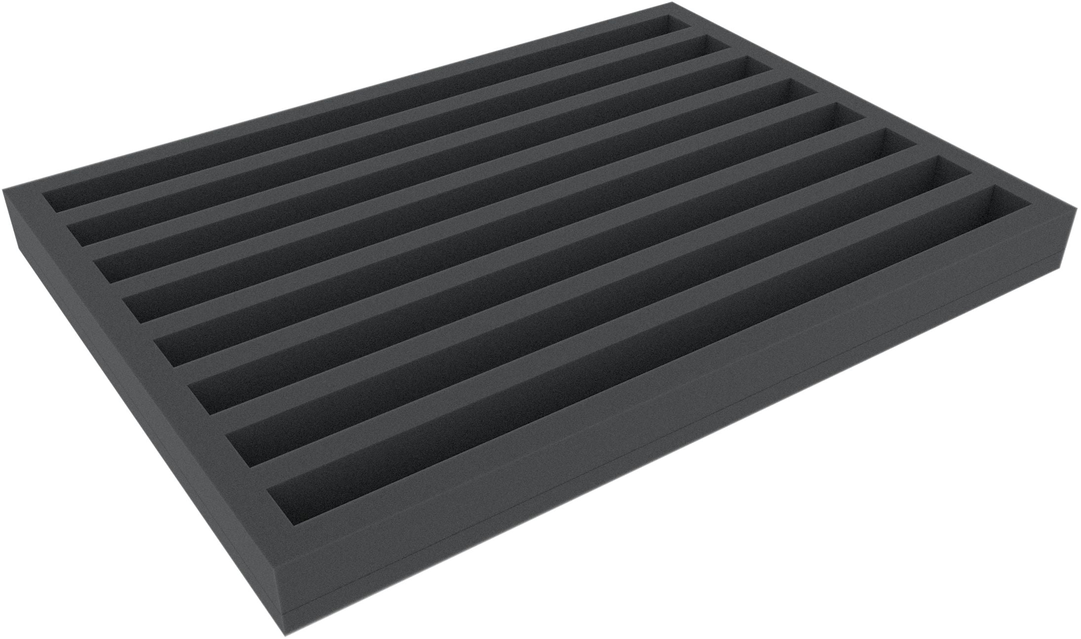 This 30 mm high foam tray is divided into 8 compartments. It is particularly suitable for the safe storage of tabletop and board game miniatures, model trains, as well as other fragile models and small parts.