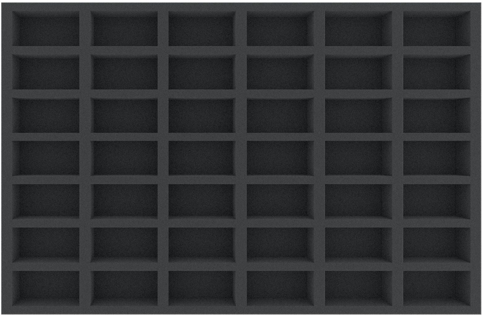 This 40 mm high foam tray is divided into 42 compartments. It is particularly suitable for the safe storage of tabletop and board game miniatures, as well as other fragile models and small parts.