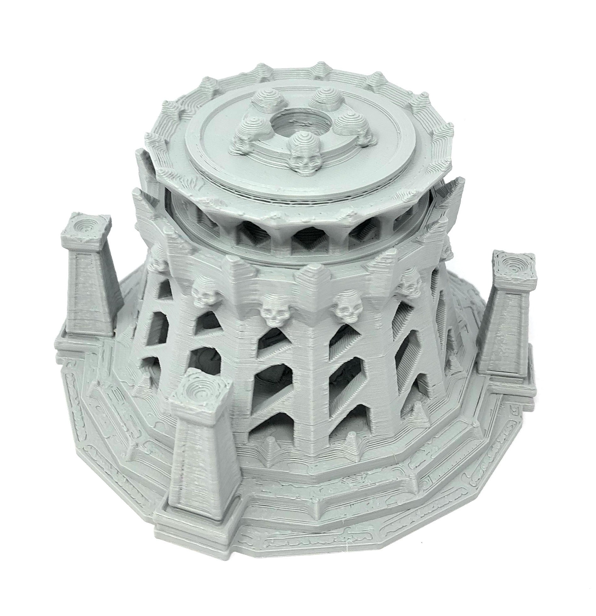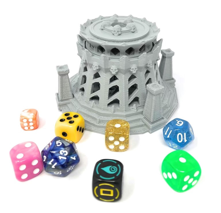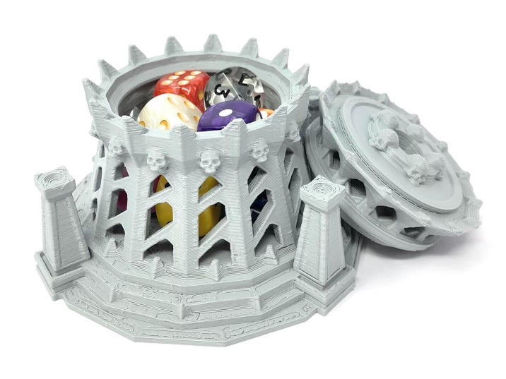 3D printed - detailed dice jail. The Dice Jail can also be used as a terrain part for your miniatures game or as a center piece for your next DnD session.