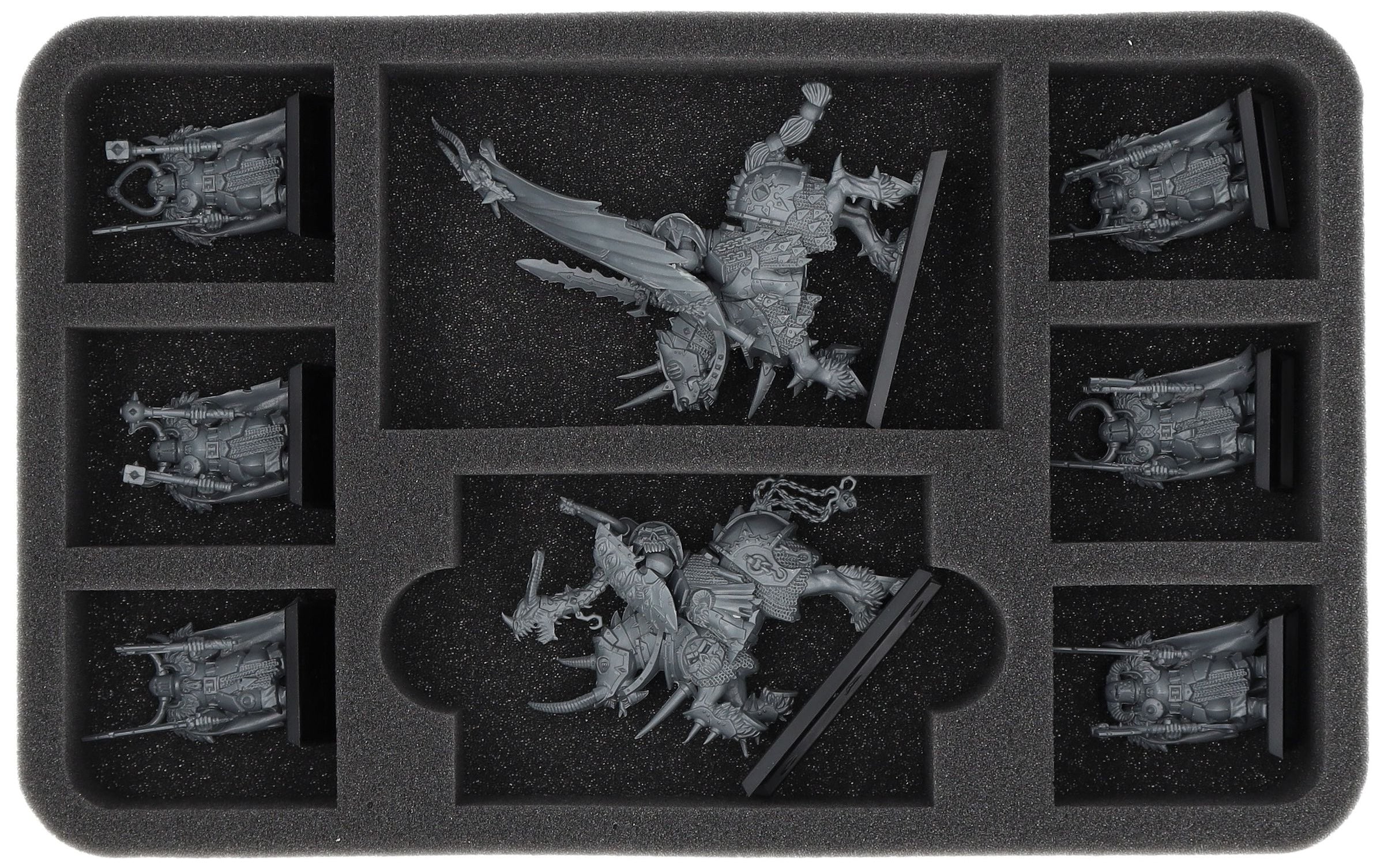 La selezione di vassoi in schiuma è orientata alle tipiche collezioni di Warriors of Chaos in Warhammer: The Old World, fornendo slot per cavalleria, fanteria e modelli più grandi. Le diverse disposizioni dei vassoi aiutano a tenere separati e ben organizzati i Cavalieri del Caos, i Cavalieri Marauder, i Guerrieri del Caos, i Predoni del Caos e gli Ogre del Drago, riducendo il contatto tra le miniature dipinte.