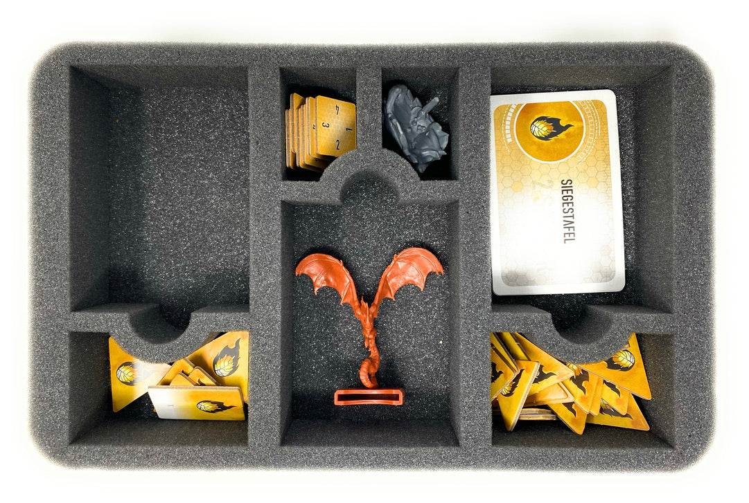 L'espansione "Tsukuyumi: Full Moon Down (Second Edition)-Fireborn"-Expansion presenta una varietà di carte, gettoni e miniature dettagliate. Affinché i modelli non soffrano di danni e il vostro materiale di gioco possa essere ordinato, c'è il corrispondente Storage Box FSLB055 che include un vassoio di schiuma Feldherr personalizzato.
