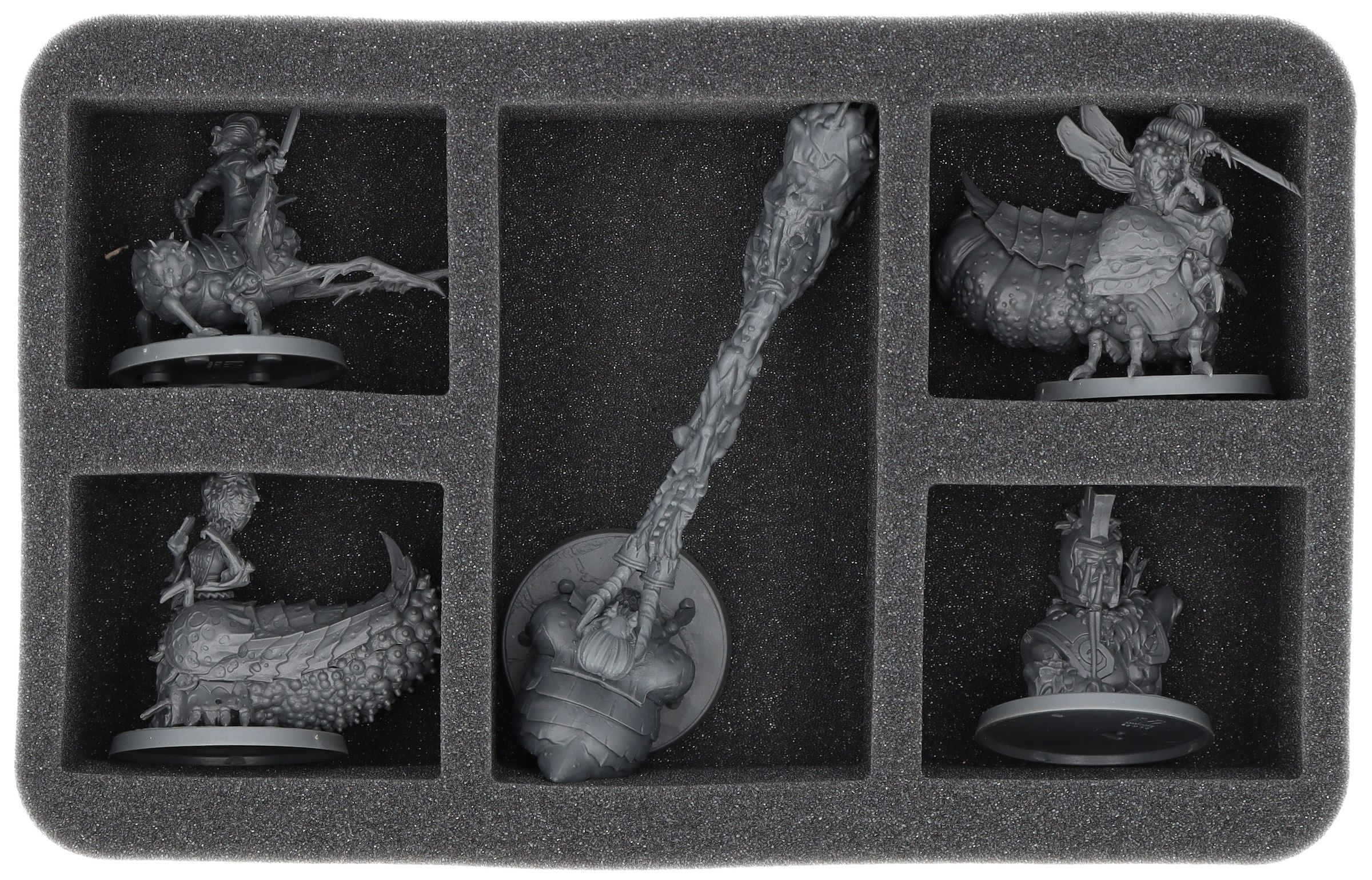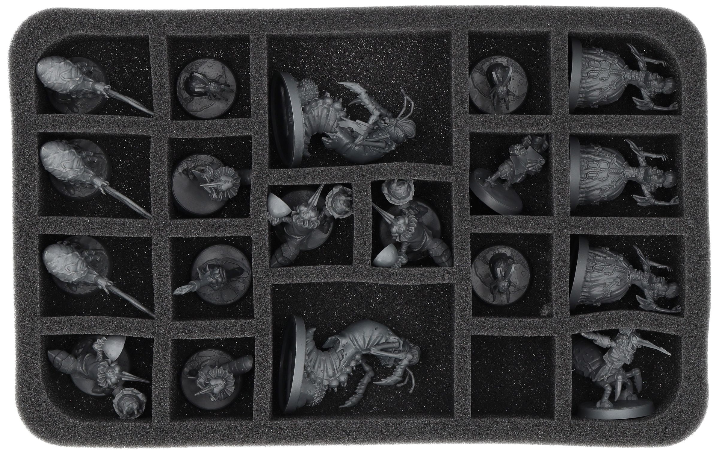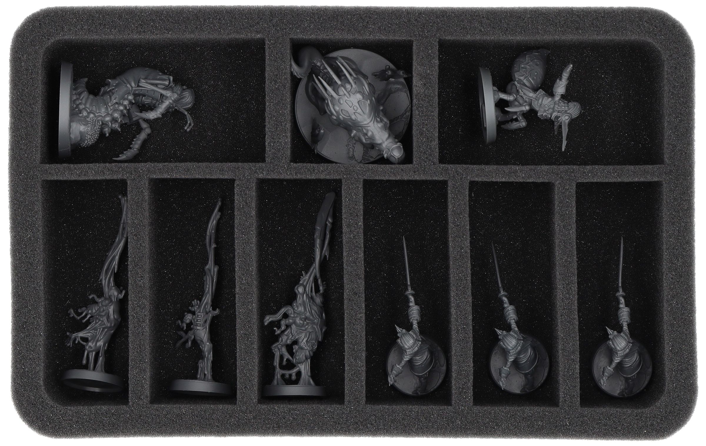 Gli scomparti tagliati su misura proteggono in modo affidabile la vostra miniature da eventuali danni. La morbida schiuma garantisce che anche le unità dipinte arrivino al tavolo da gioco senza graffi.