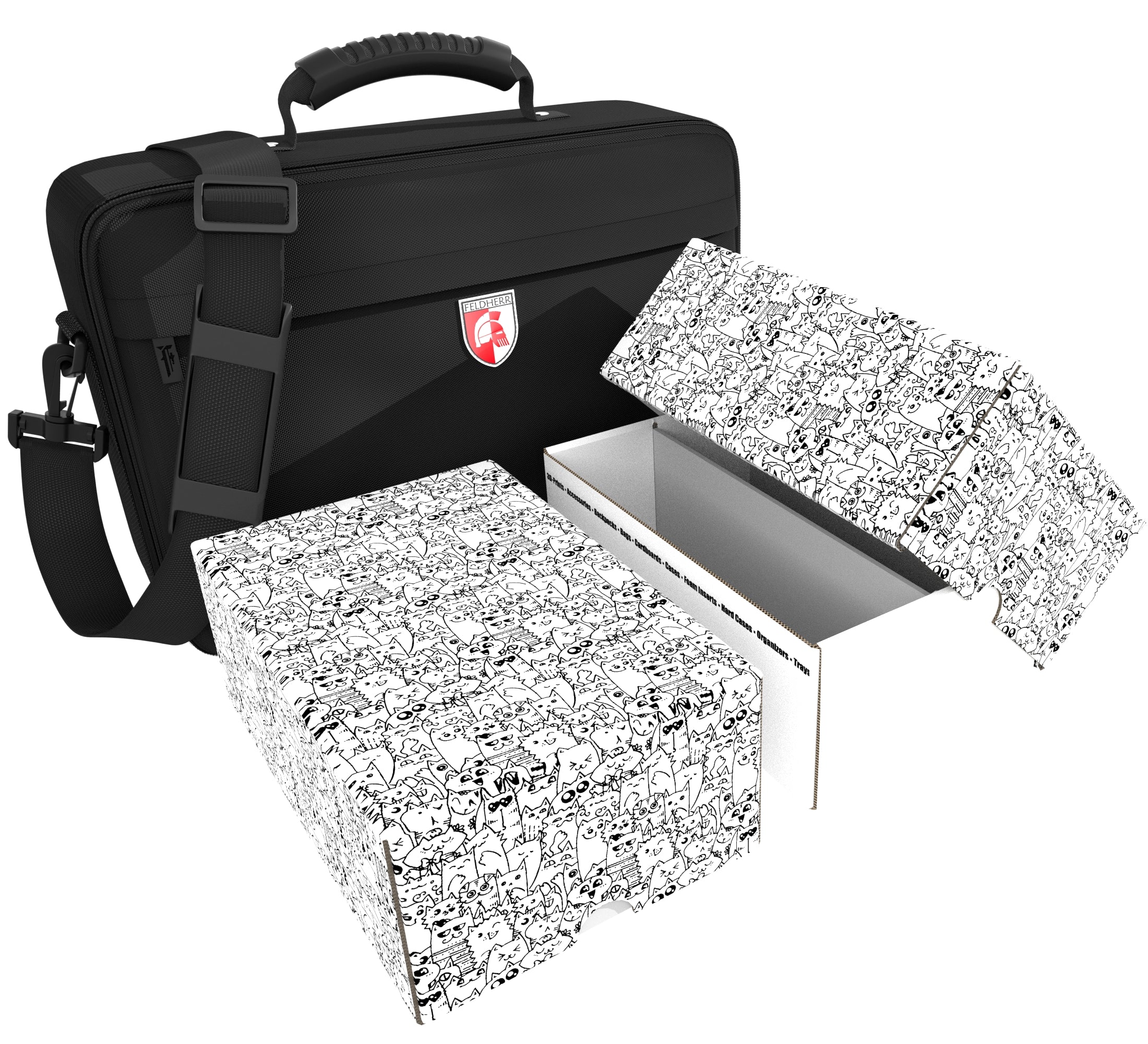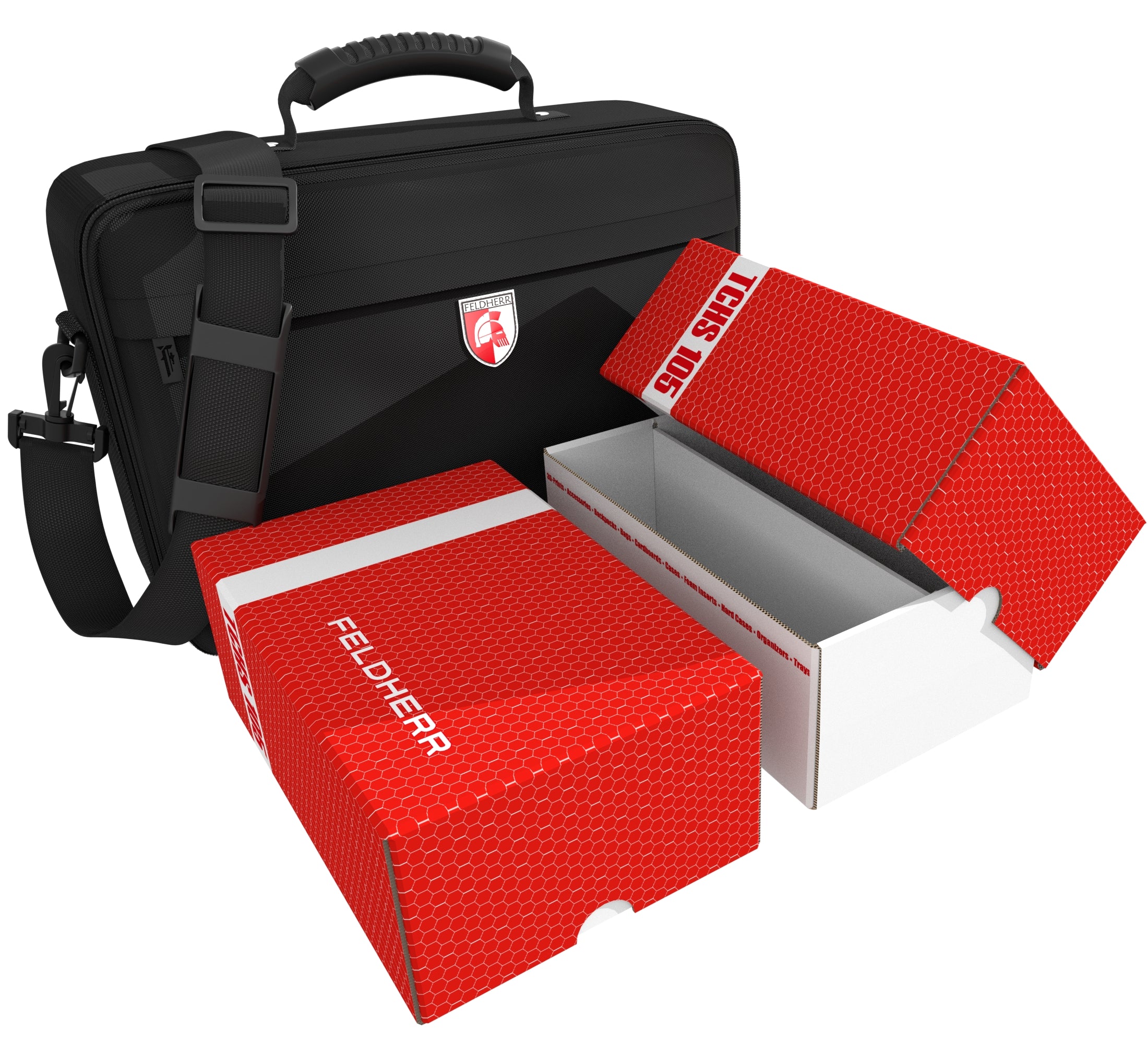 L'Feldherr MEDIUM borsa, accompagnato da due Storage Box TCHS105, offre un ampio spazio per un massimo di 3200 carte. Con questa configurazione, potrete portare la vostra collezione alle serate di gioco senza preoccuparvi di piegature o graffi, permettendovi di immergervi completamente nel gioco.