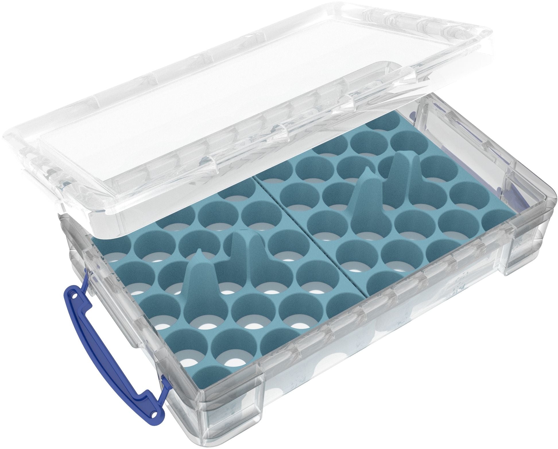 It started with a few colors and miniatures - but now your small selection has grown into a colorful collection, and the color bottles roll happily across the table. To make sure the paint pots know where they belong, here's the perfect all-in-one solution: with two custom-made paint racks and a sturdy 4-liter Really Useful Box, you can bring order to your creative chaos - compact, handy, and safe to transport.