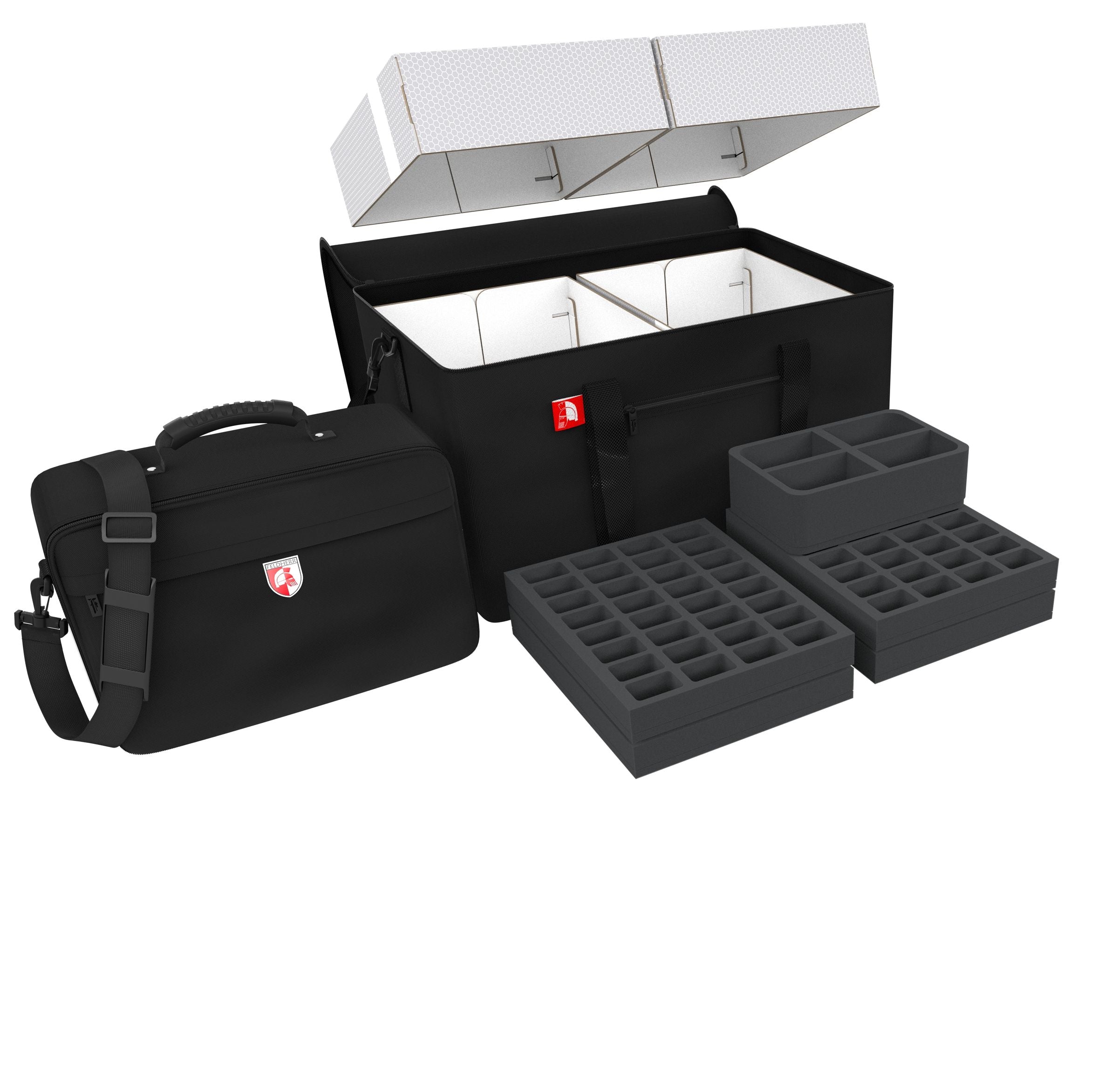 Per rendere giustizia alle dimensioni epiche del set completo di "Ankh: Gods of Egypt", abbiamo legato in un fascio 1 borsa Feldherr Transporter, 2 Storage Boxes, 1 borsa MAXI, 5 Full-Size, 17 inserti di schiuma Half-Size e 1 tappetino di schiuma e 5 topper. Quindi, tutte le miniature e tutto il materiale di gioco, sono ottimamente protetti e chiaramente organizzati conservati.