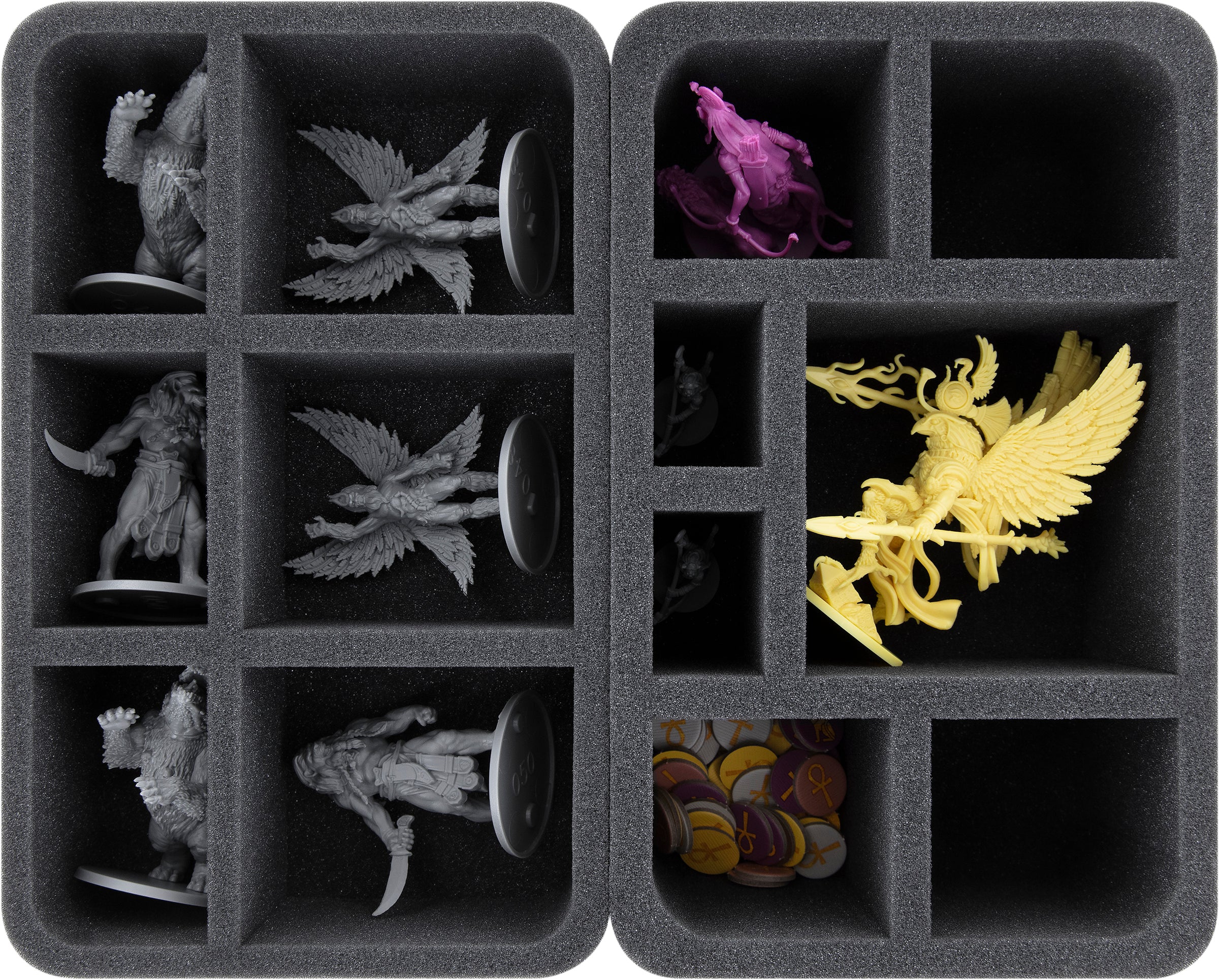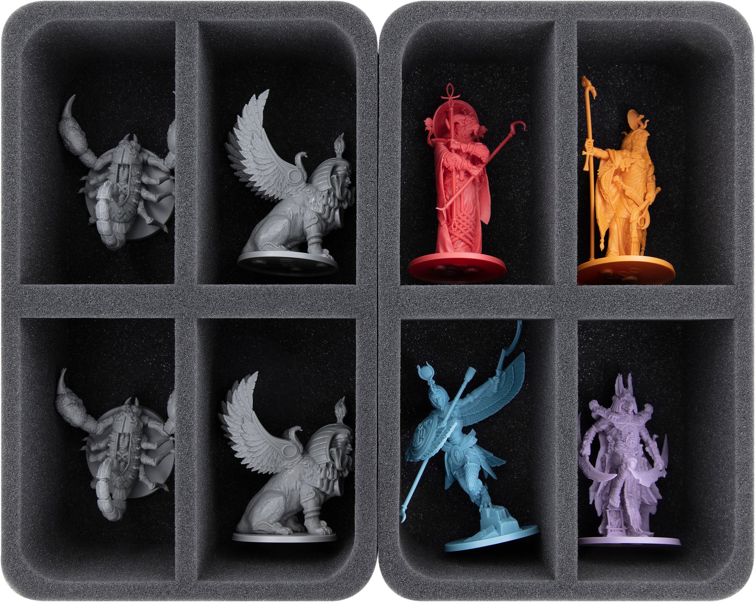 • 2 vassoi in schiuma Half-Size con 4 scomparti ciascuno per grandi miniature come Androsphinx, Scorpioni Giganti, Ra, Anubi, Iside, Ramun (HSMFEA080BO)