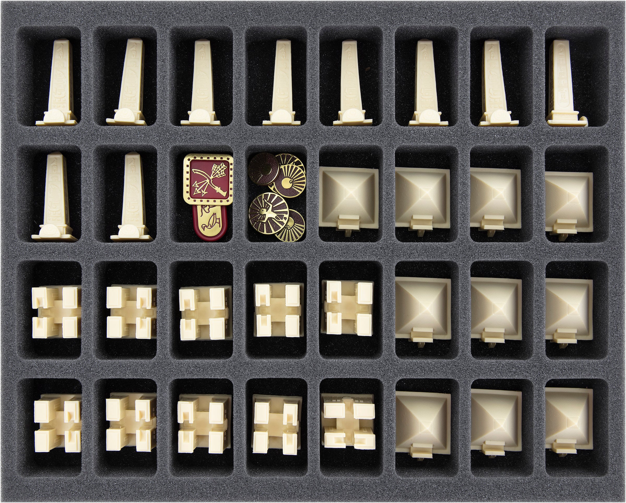 • 1 vassoio in schiuma Full-Size con 32 scomparti per miniature come Templi 3D, Obelischi 3D e Piramidi 3D + materiali di gioco (FSMEDS040BO)