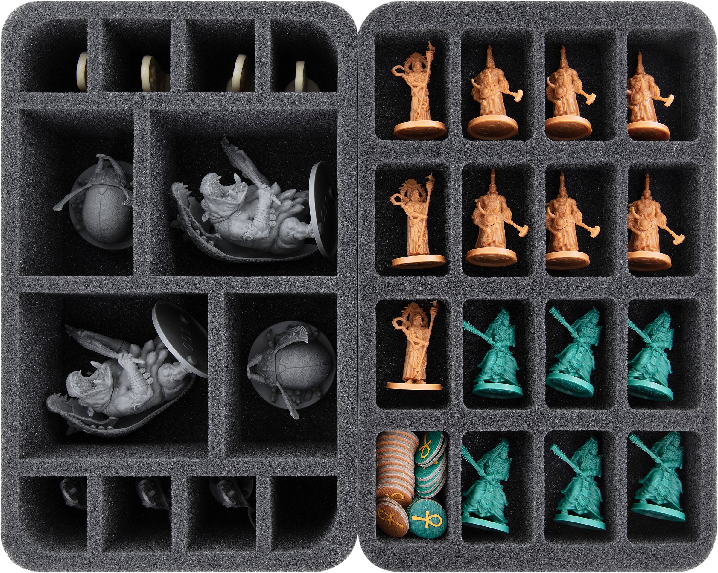 • 2 vassoi in schiuma Full-Size con 32 scomparti ciascuno per piccole miniature come Guerrieri, Sacerdoti, Mummie Gatto, Mummie, Satet + Sfingi 3D esclusive Kickstarter (FSMEDS040BO)