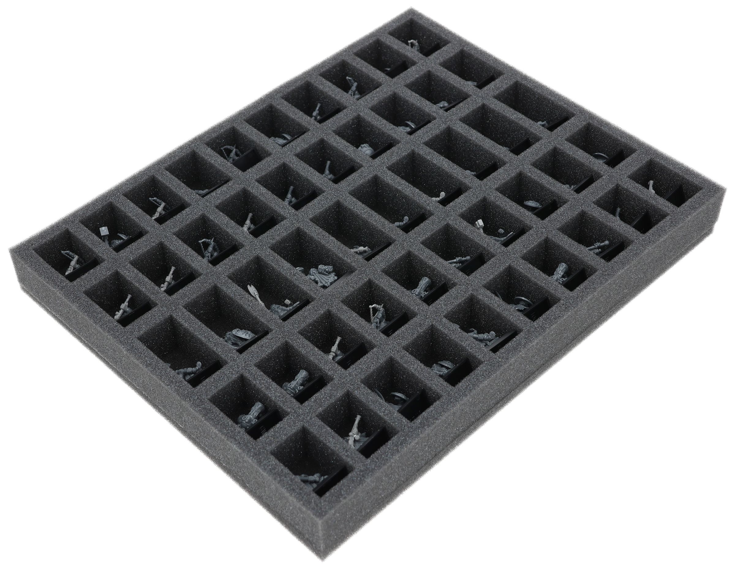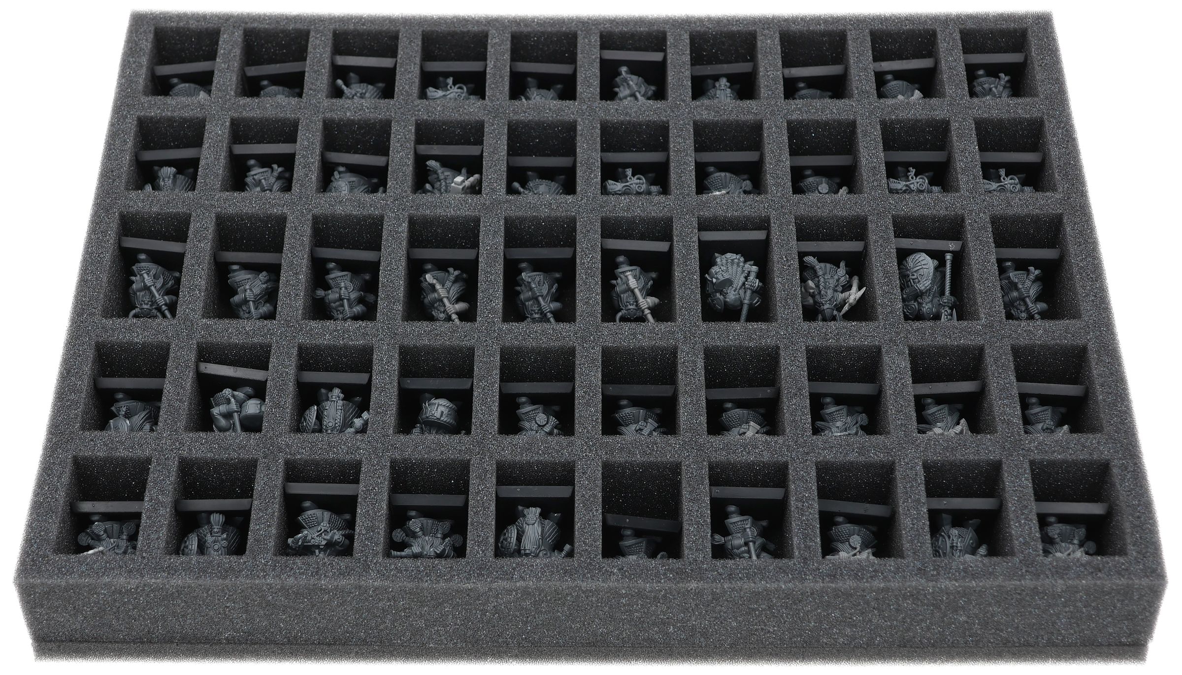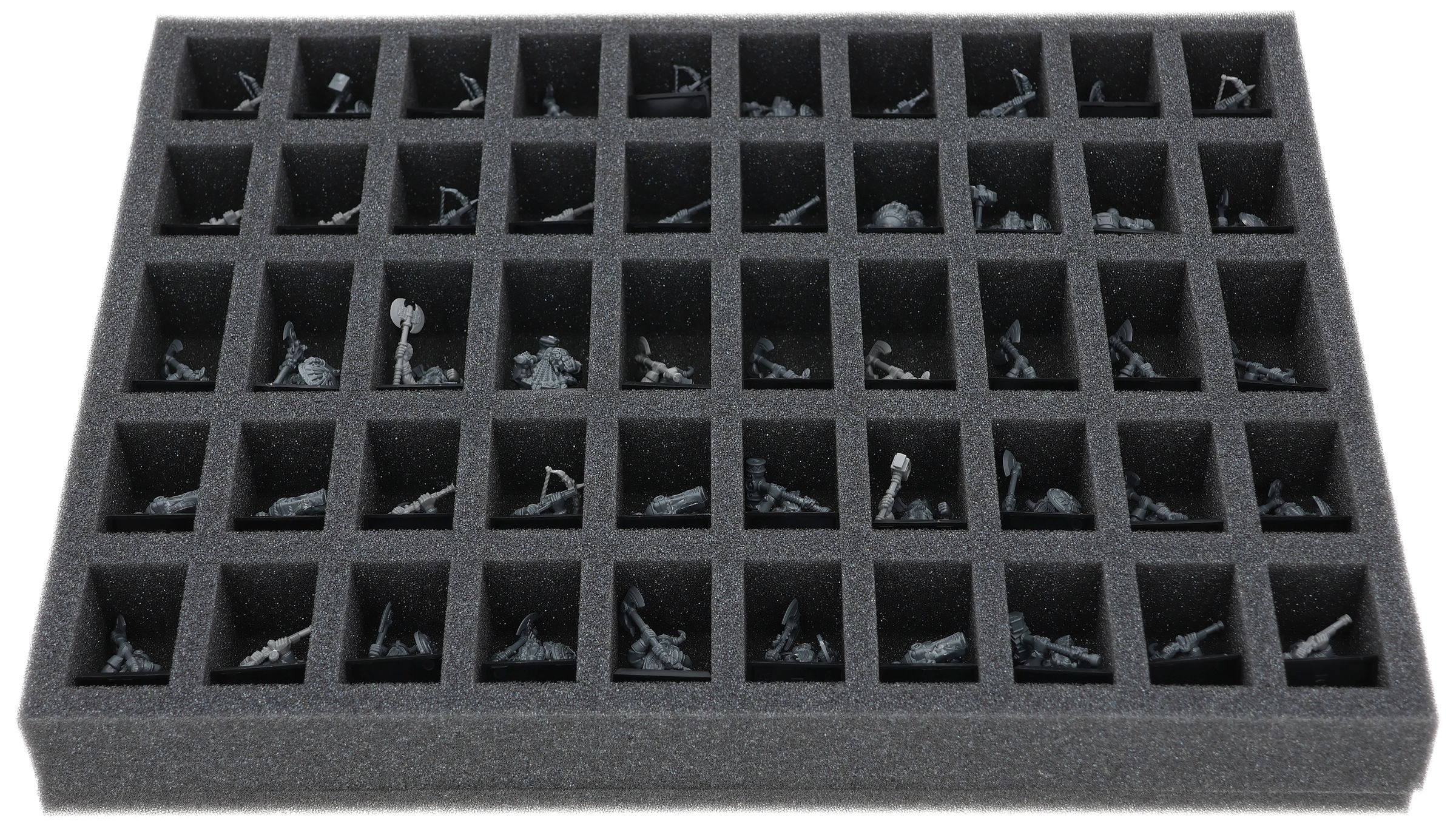 Su questo vassoio di schiuma Feldherr c'è spazio per un massimo di 50 miniature del vostro esercito. L'inserto è particolarmente adatto per riporre i Guerrieri Nani, i Nani Quarrelers, i Nani Ironbreakers, i Nani Hammerers, i Nani Slayers e modelli di dimensioni simili.