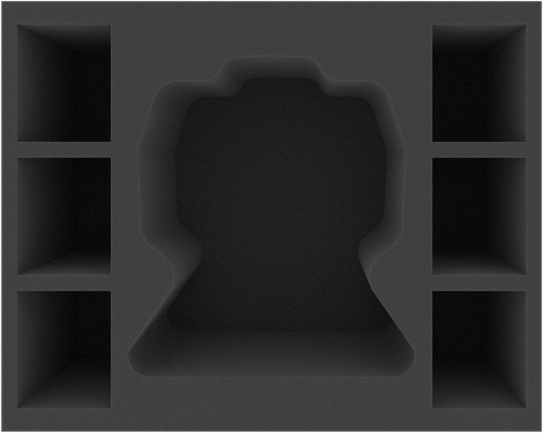 Un grande scomparto al centro è fatto su misura per un modello del Cavaliere Castellano. Qui ci sta anche un Cavaliere Valiant. Il taglio su misura assicura che la miniatura sia saldamente imballata nella schiuma tutt'intorno e che non accada nulla alla figura mentre si dirige verso il piano del tavolo. Il modello giace al sicuro e fissato al suo posto e i colori del Cavaliere dipinto sono protetti in modo ottimale da graffi e abrasioni.