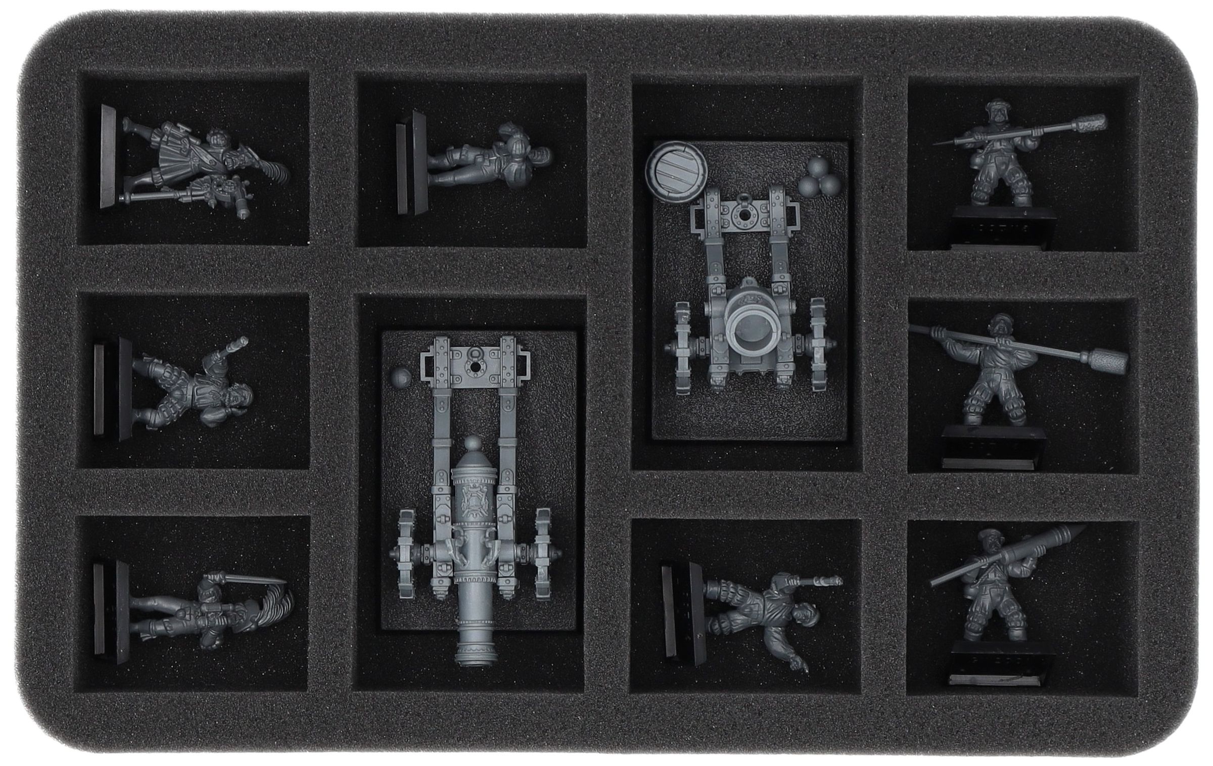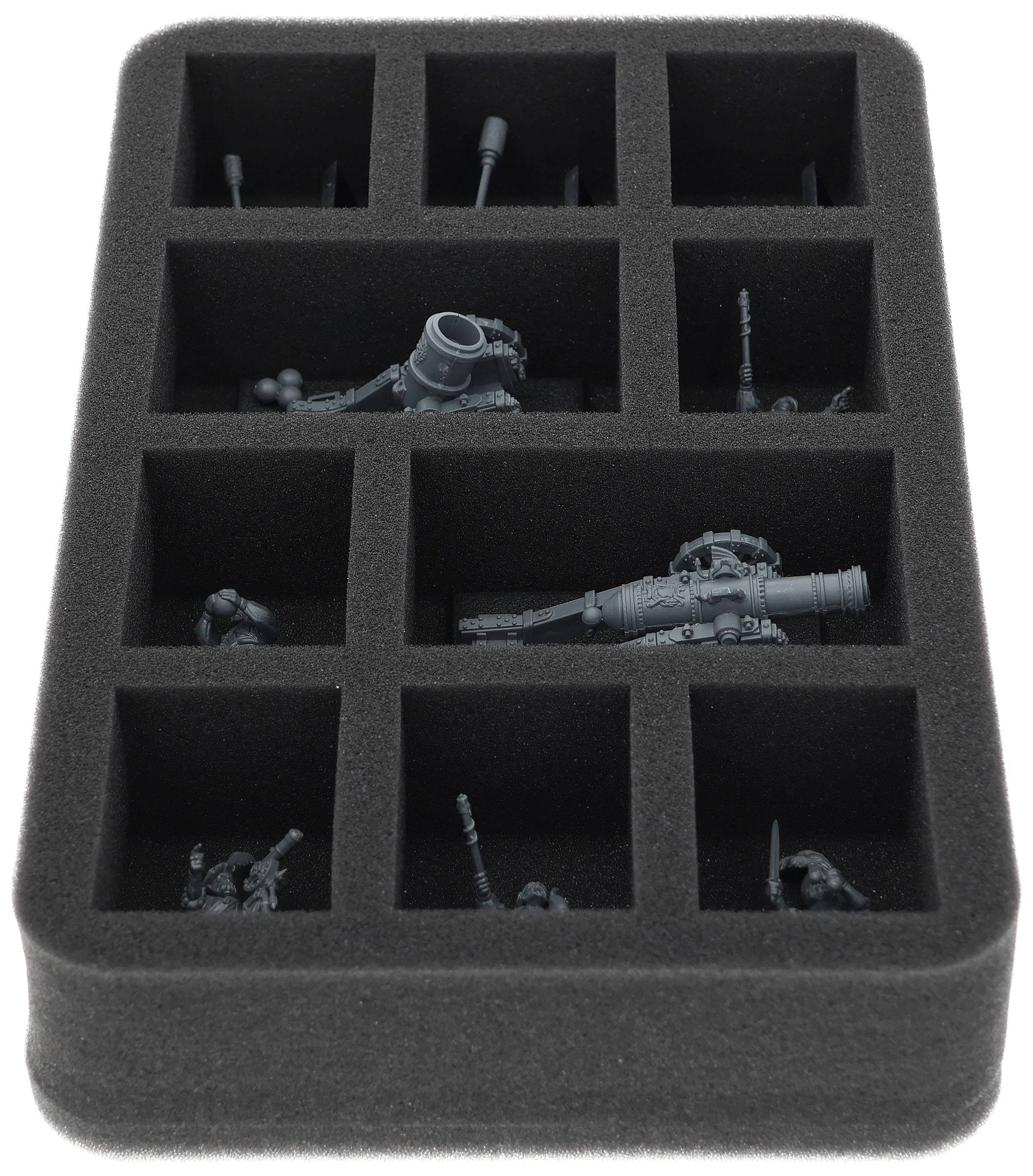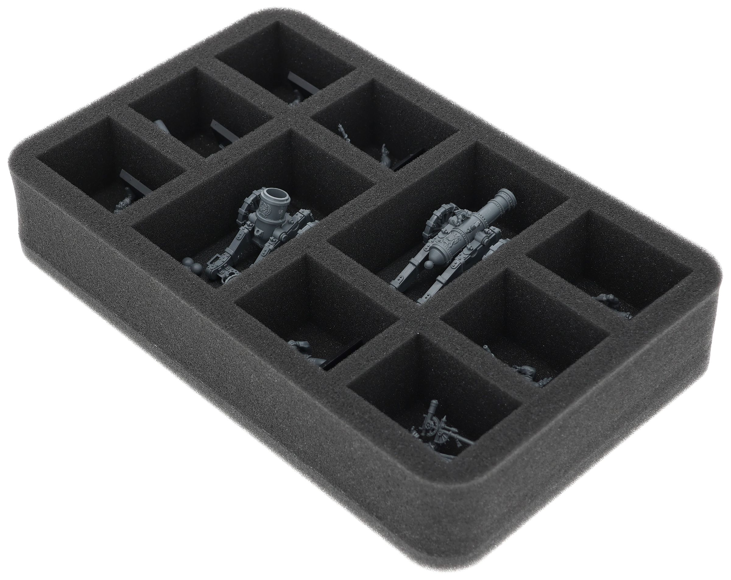 Su questo vassoio in schiuma Feldherr c'è spazio per un massimo di 10 miniature del vostro esercito. L'inserto è particolarmente adatto per riporre cannoni e mortai e modelli di dimensioni simili.
