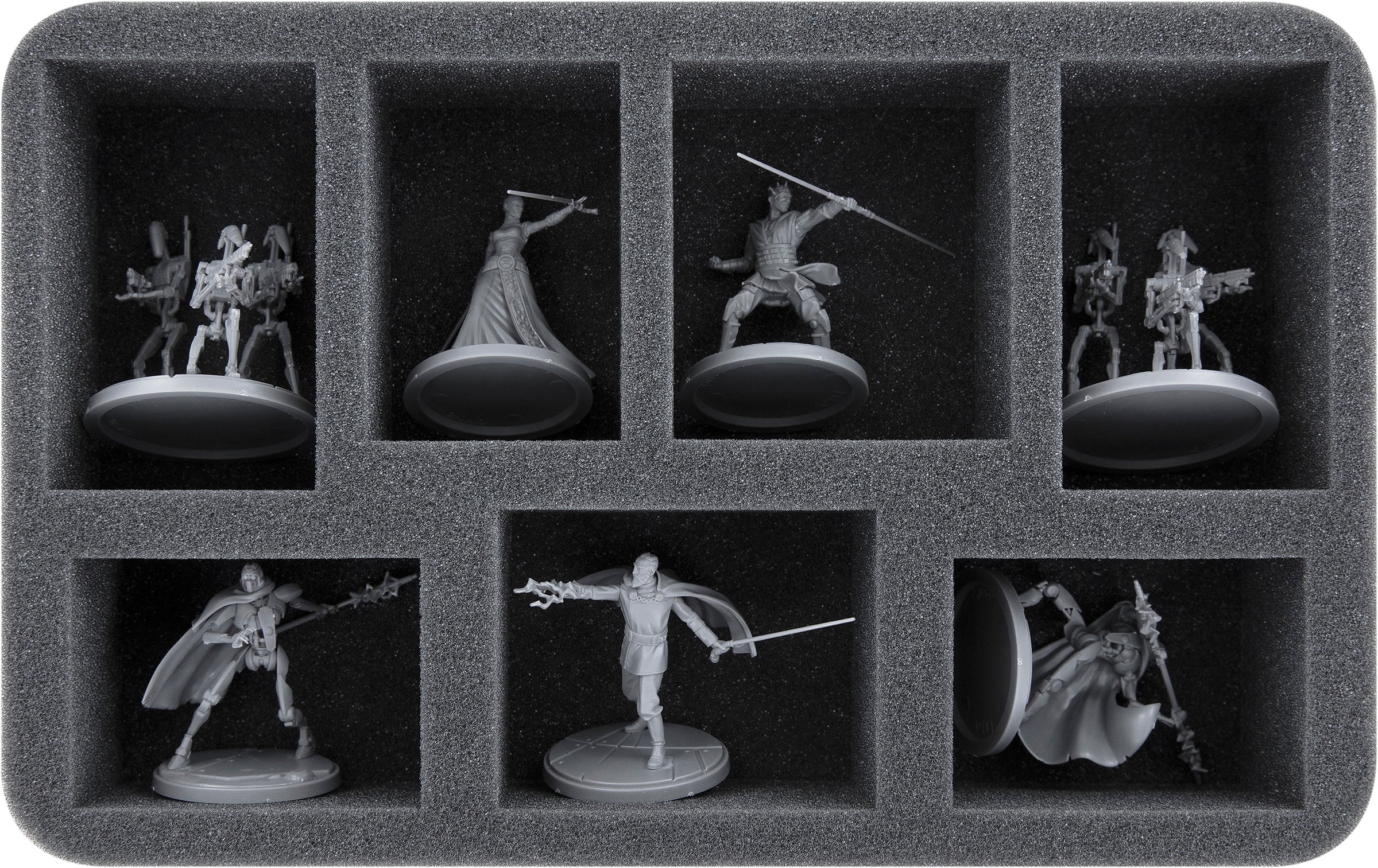 L'Vassoio per schuma offre spazio per gli miniature più grandi su basi fino a 50 mm, in modo che abbiano abbastanza spazio libero. Diviso in sette scomparti, il vassoio è adatto per conservare in modo sicuro figure come Lord Maul, il Conte Dooku, Asajj Ventress e miniature con dimensioni simili.