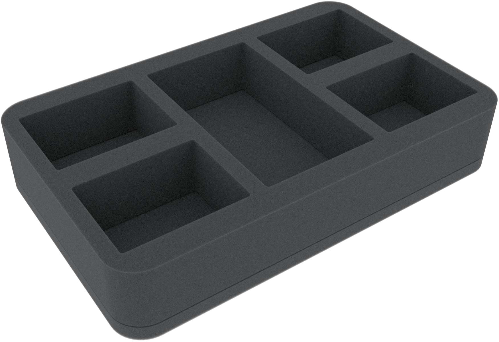 Questo vassoio in schiuma Half-Size ha 5 scomparti di diverse dimensioni. È particolarmente adatto per la conservazione di materiale di gioco come carte, piastrelle o gettoni.