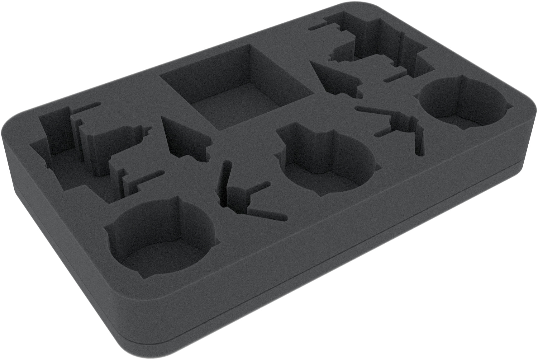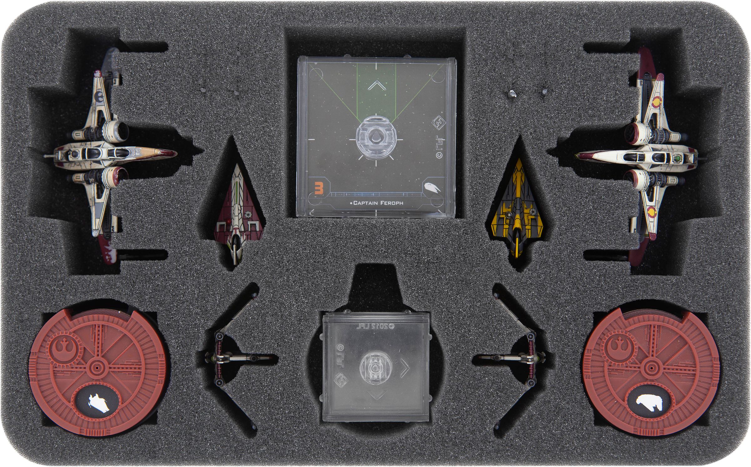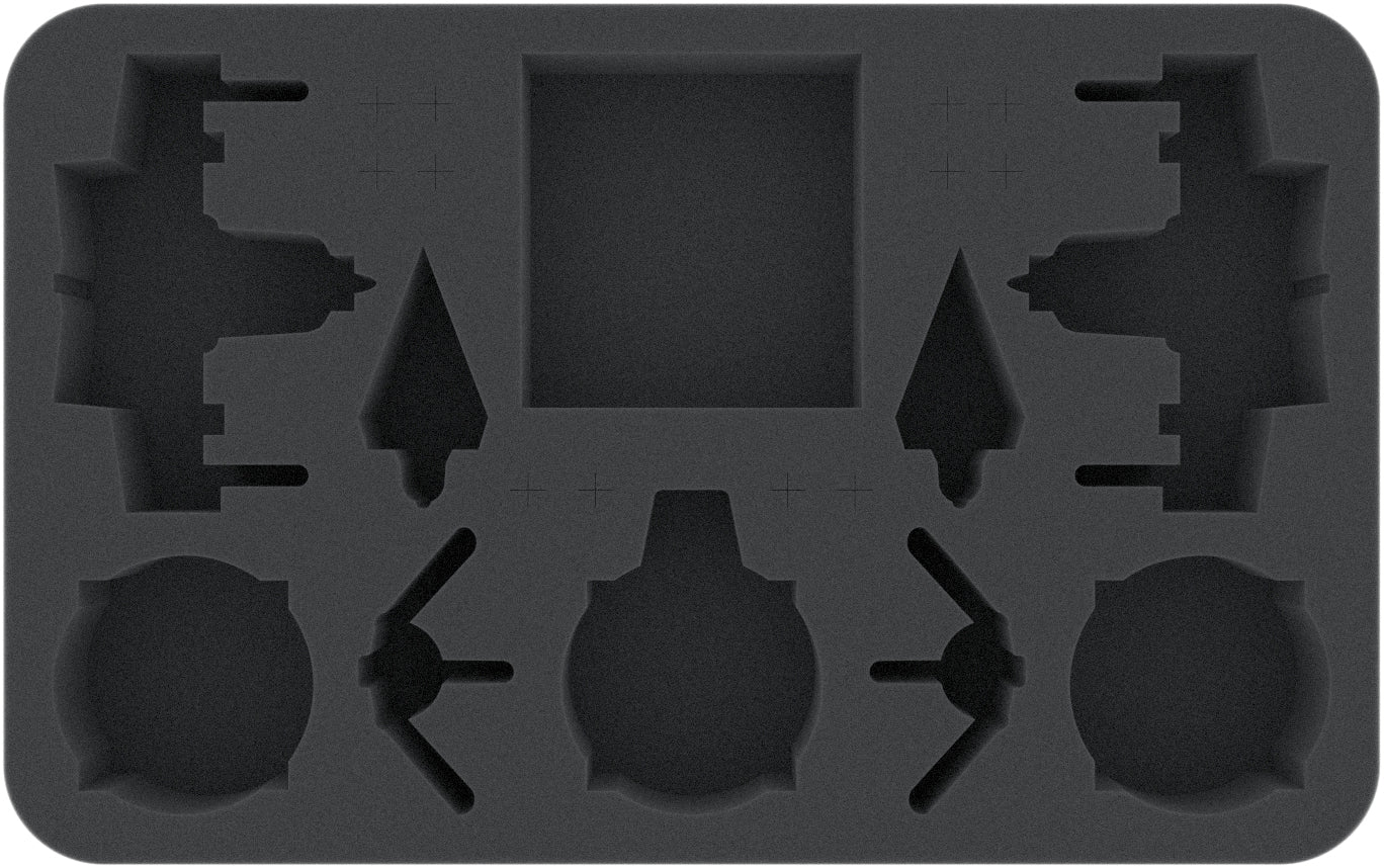 Per ogni vostra nave c'è uno scomparto con taglio preciso in miniatura su questo inserto Half-Size. Il taglio preciso e preciso assicura un'aderenza stabile in modo che la miniatura della nave rimanga al suo posto durante il trasporto. Questo non solo protegge le parti fini come le ali, le antenne e le armi da danni, ma anche la vernice da abrasioni e graffi.
